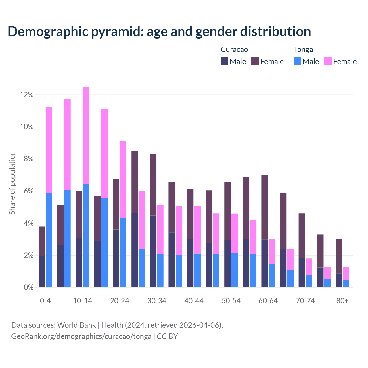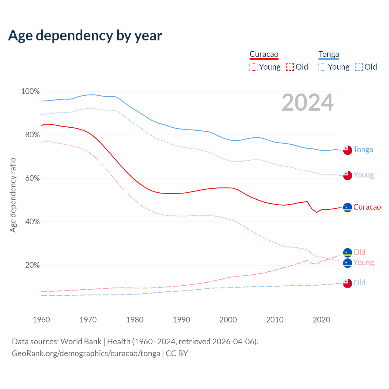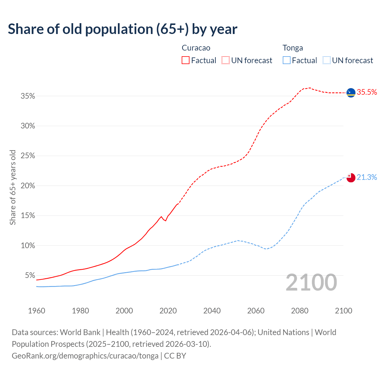 - The share of old-age demographic (65+) in Curacao is 16.8% vs 6.72% in Tonga.
