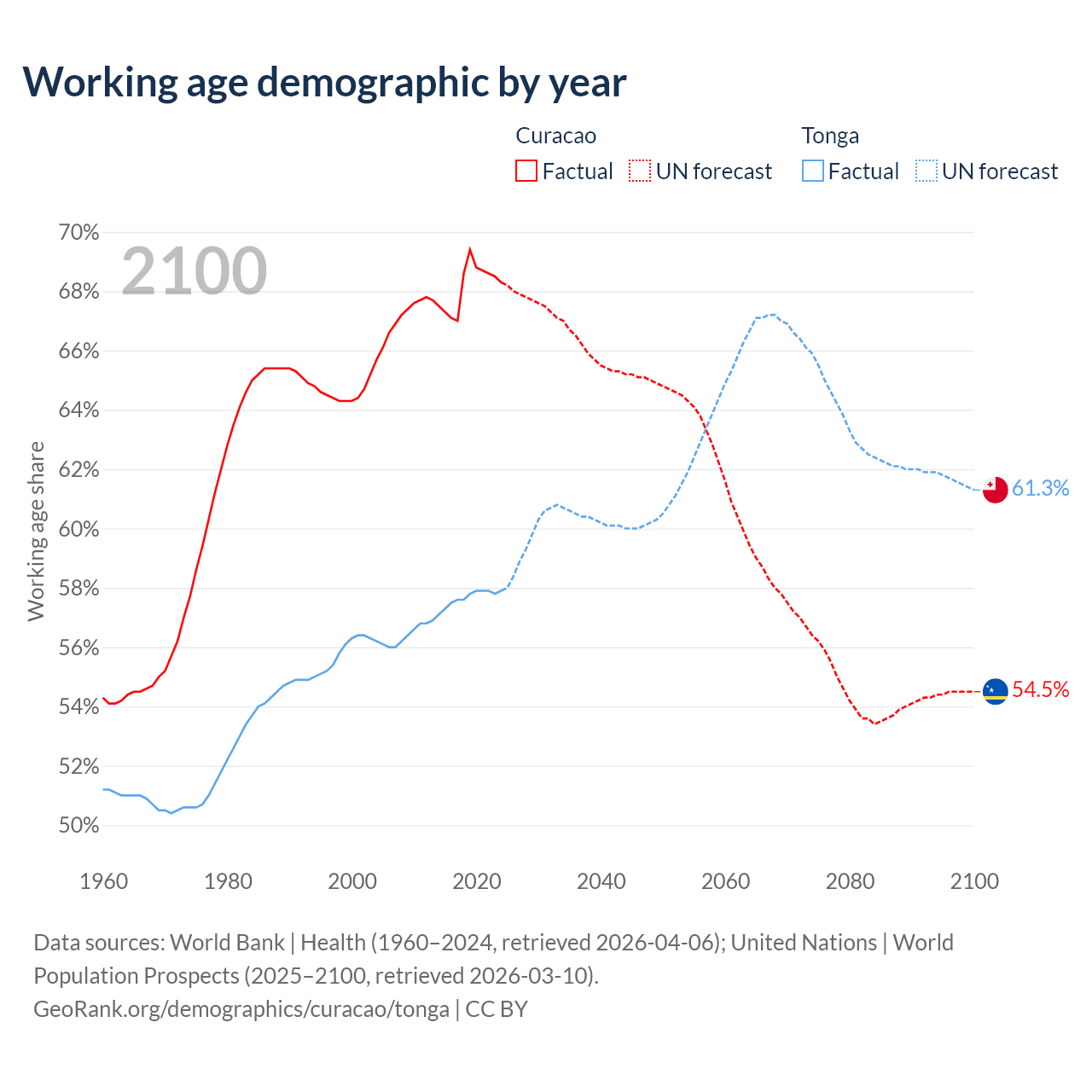 - Curacao has 107K working age adults (aged 15-64) vs 59.8K in Tonga.