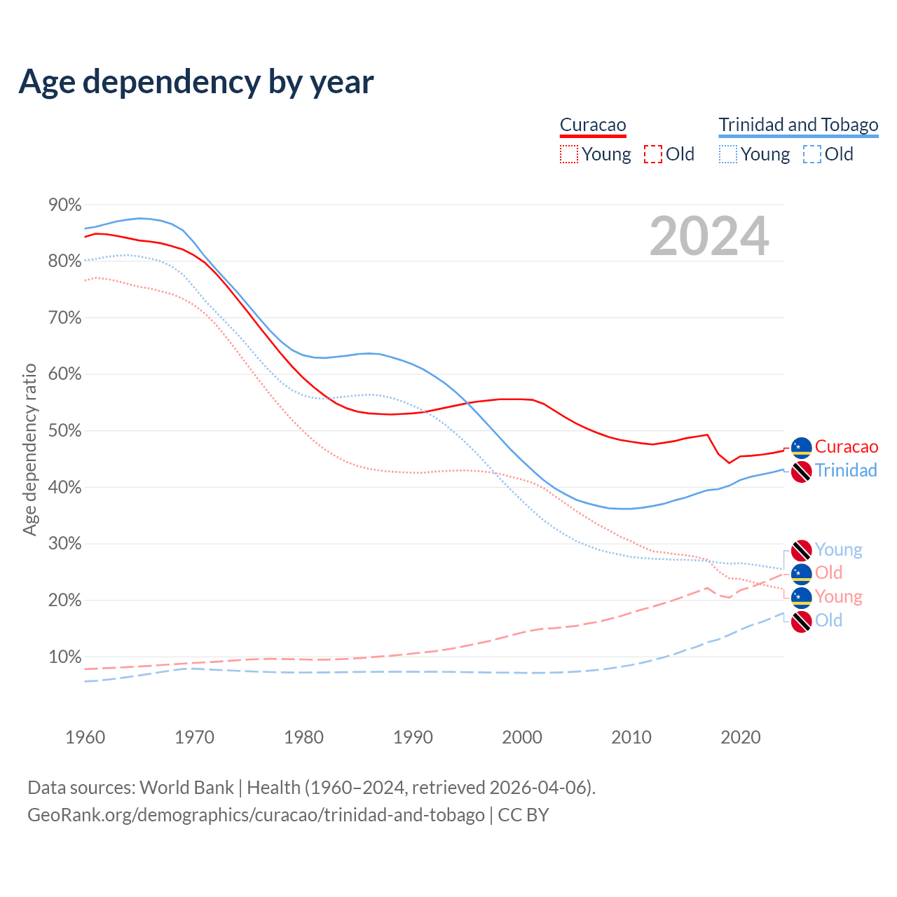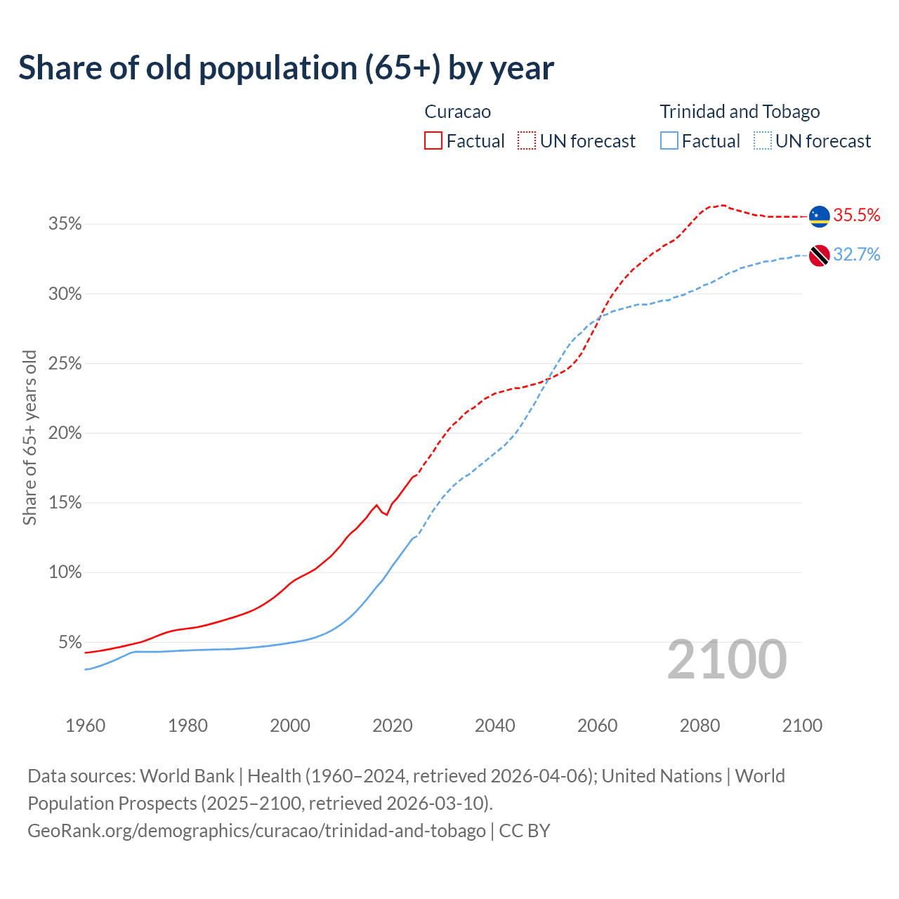 - The share of old-age demographic (65+) in Curacao is 16.8% vs 12.4% in Trinidad and Tobago.