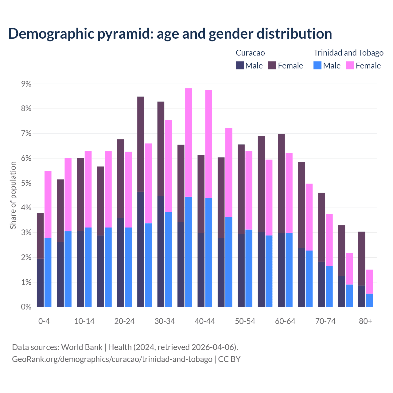 - Curacao is ranked 49/196 by median age (oldest to youngest) vs 58/196 for Trinidad and Tobago.