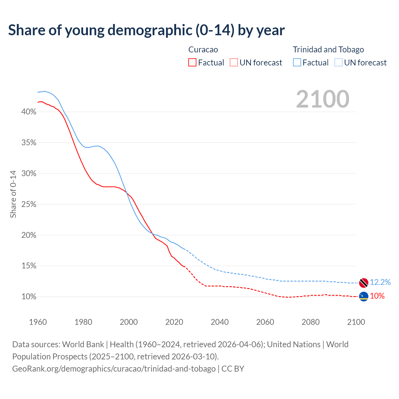 - The share of young demographic (0-15 years old) in Curacao is 14.9% vs 17.8% in Trinidad and Tobago.