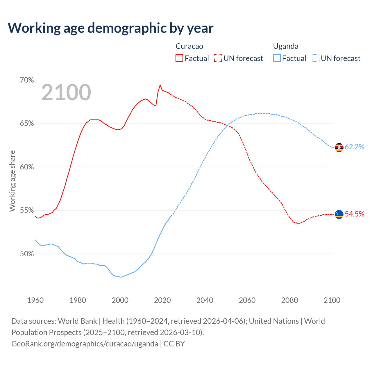 - The share of old-age demographic (65+) in Curacao is 16.8% vs 2.19% in Uganda.