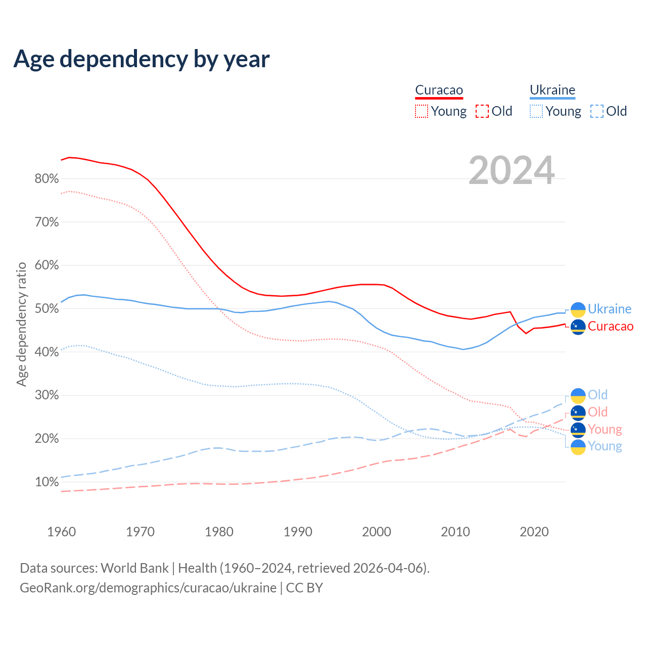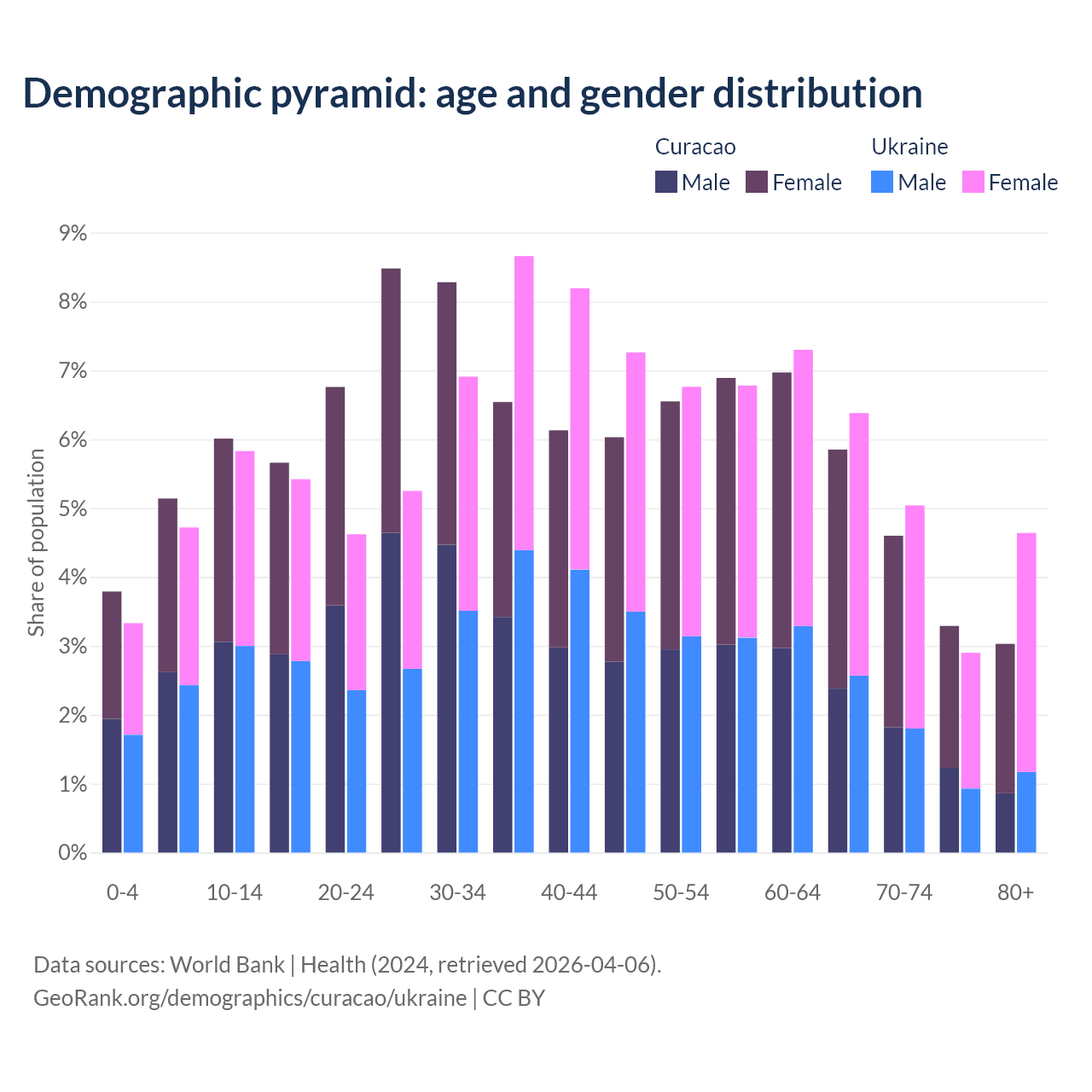 - Curacao is ranked 49/196 by median age (oldest to youngest) vs 26/196 for Ukraine.