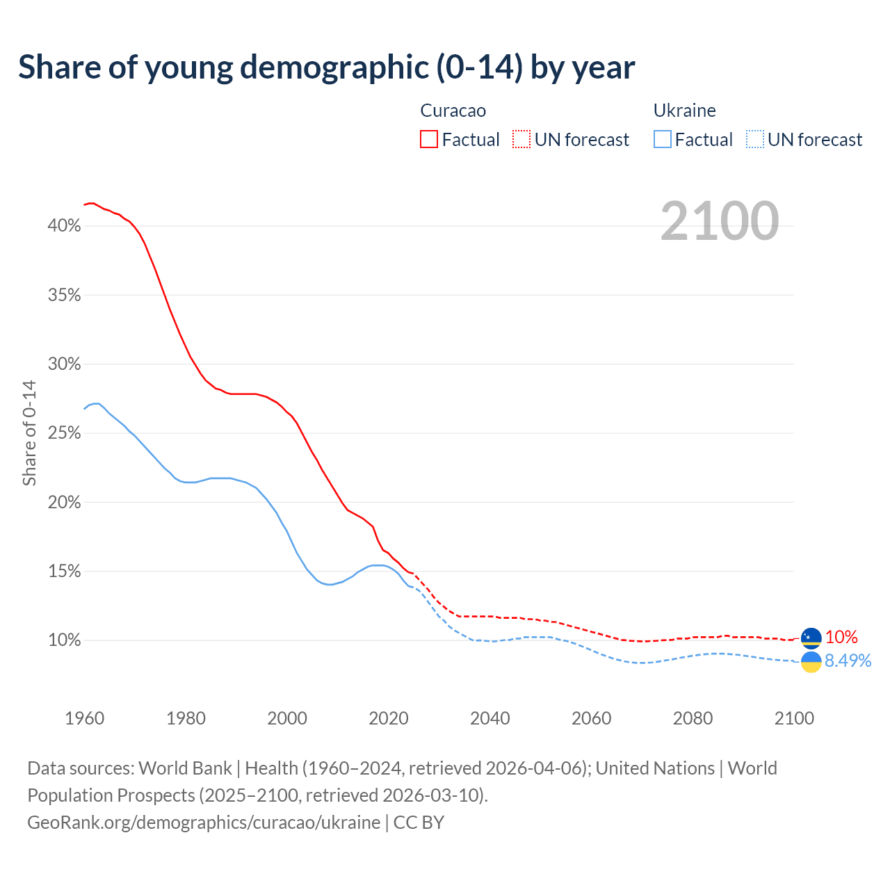 - The share of young demographic (0-15 years old) in Curacao is 14.9% vs 13.9% in Ukraine.