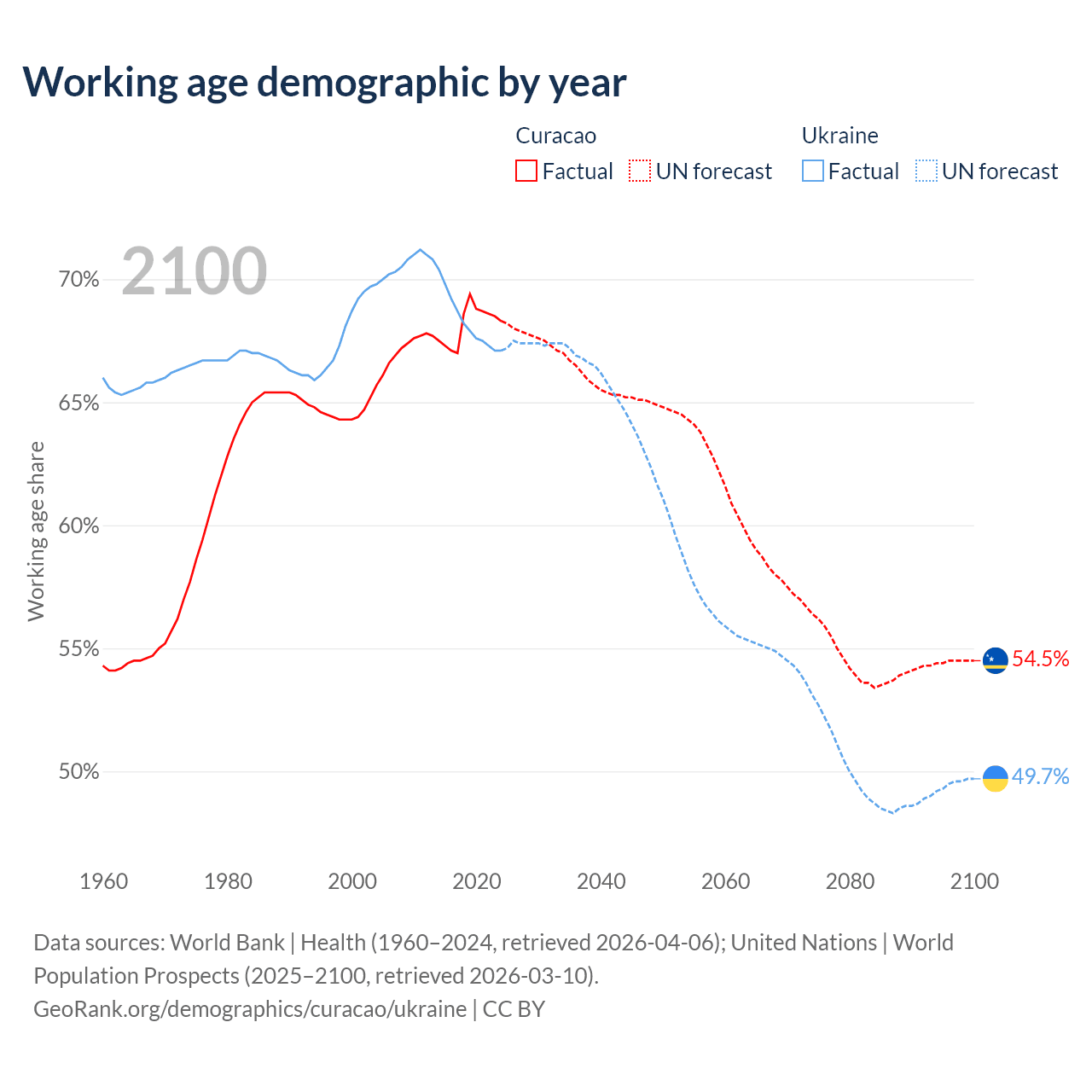 - Curacao has 107K working age adults (aged 15-64) vs 26.9M in Ukraine.