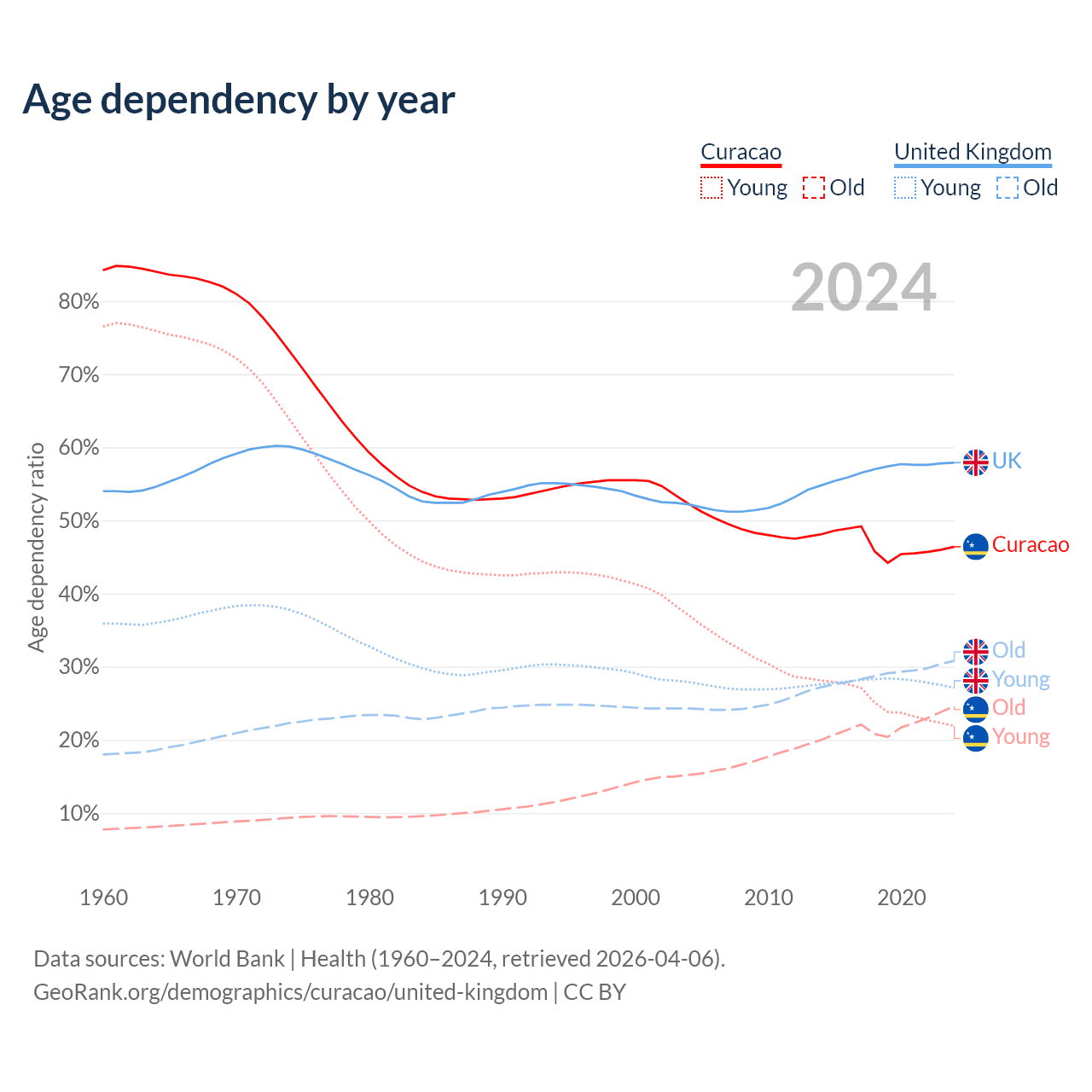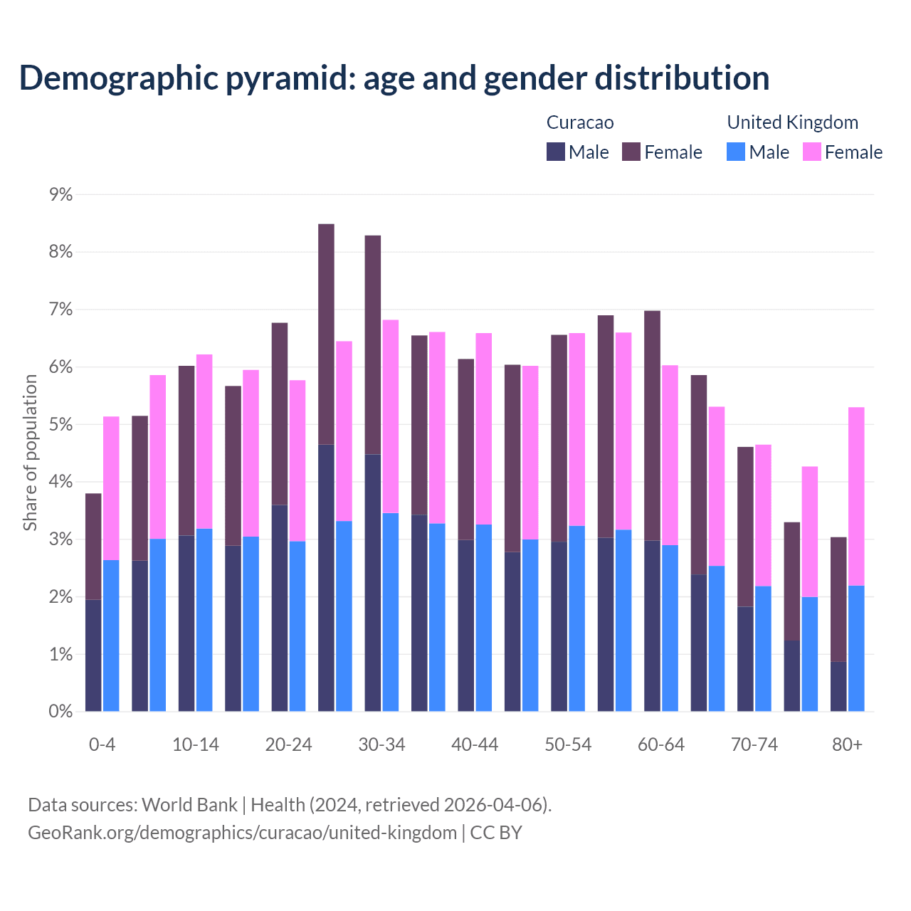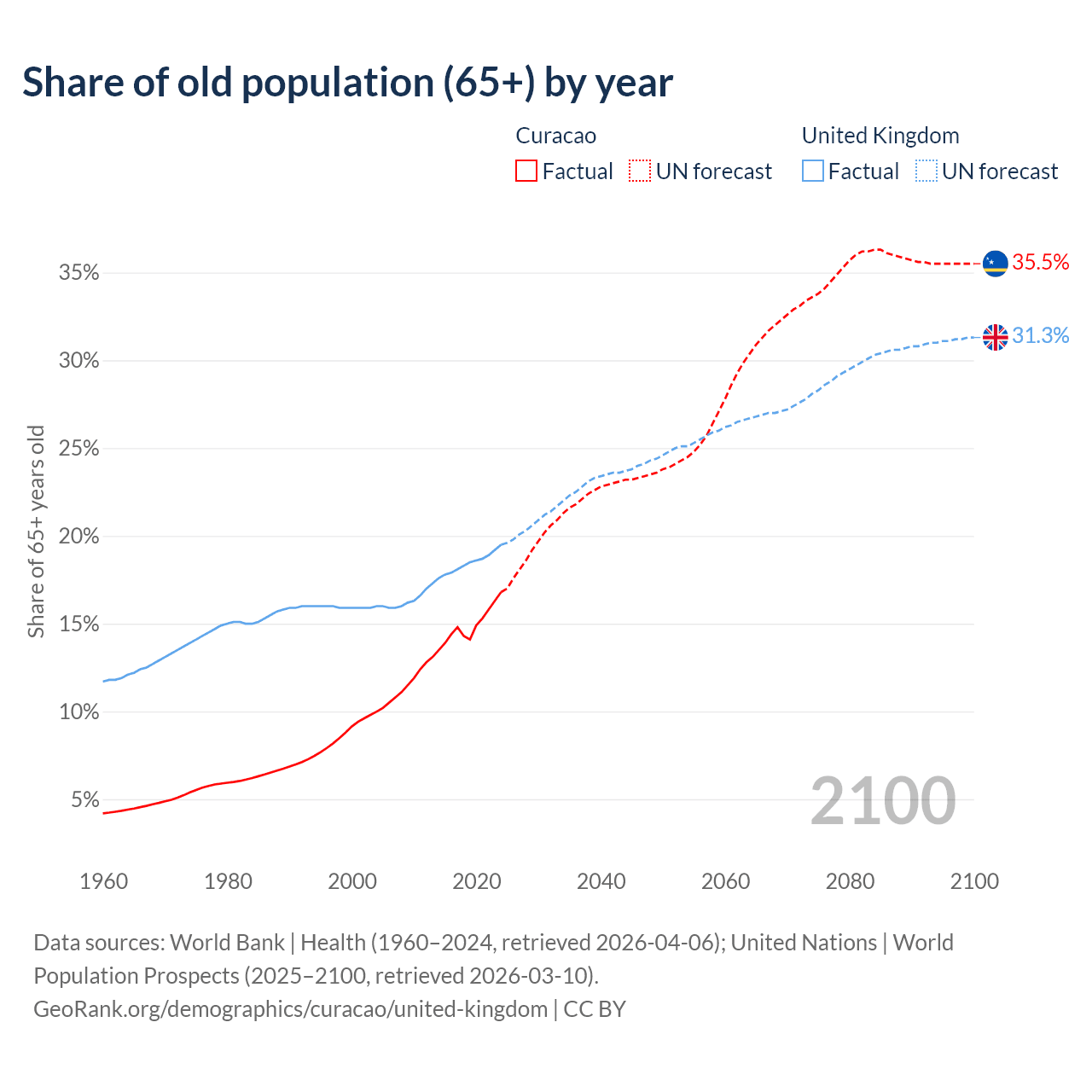 - The share of old-age demographic (65+) in Curacao is 16.8% vs 19.5% in the United Kingdom.