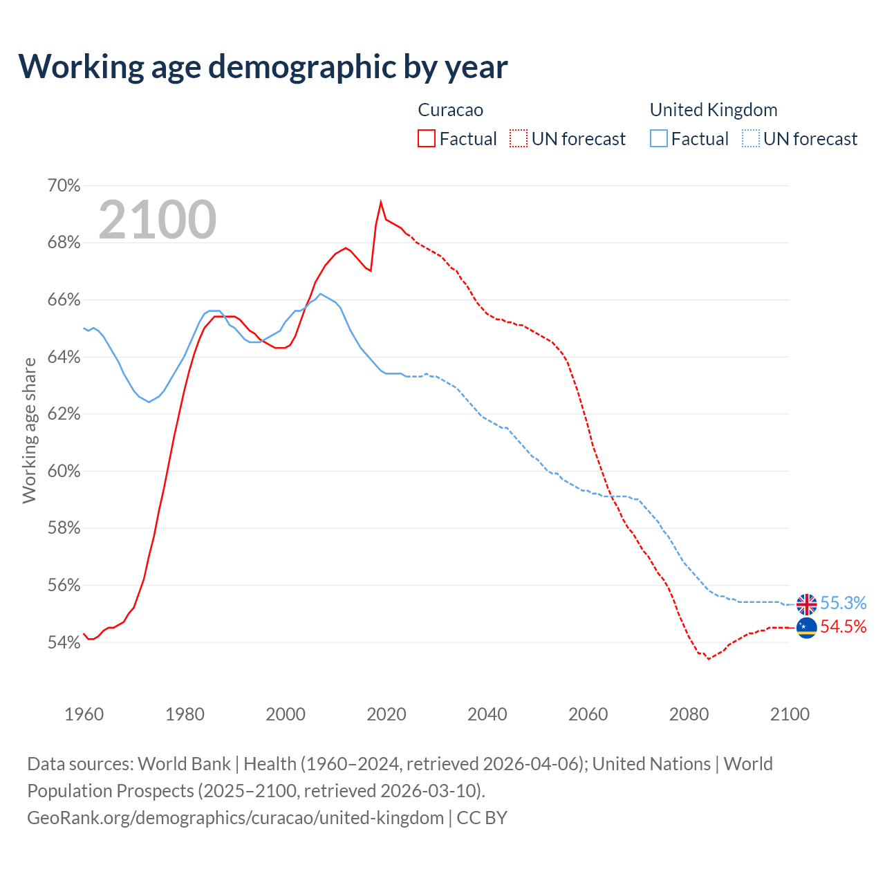 - Curacao has 107K working age adults (aged 15-64) vs 44.4M in the United Kingdom.