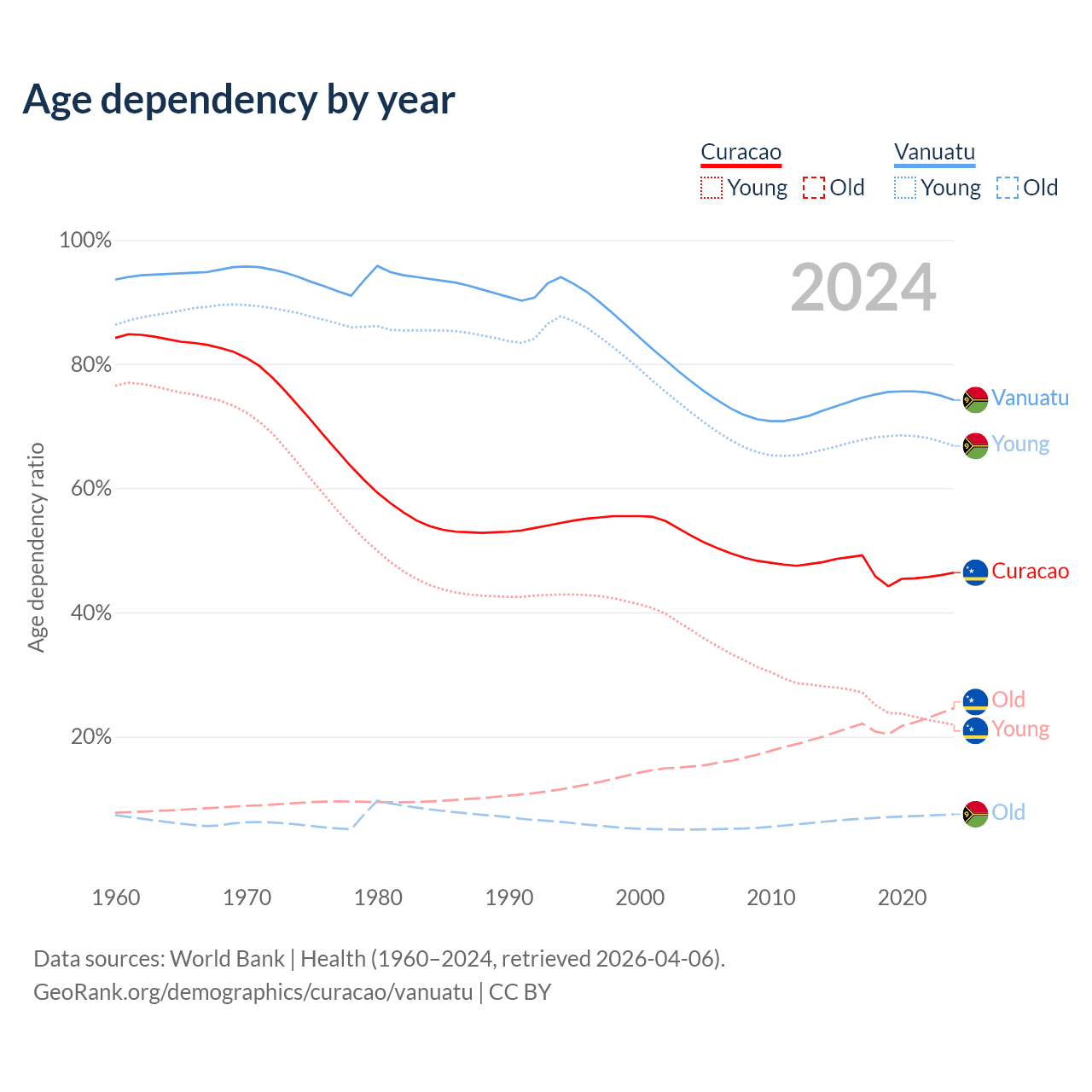 - The share of old-age demographic (65+) in Curacao is 16.8% vs 4.3% in Vanuatu.