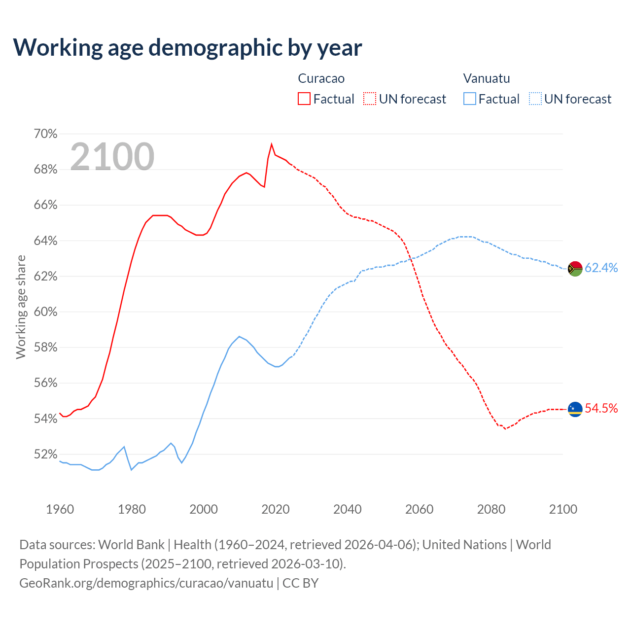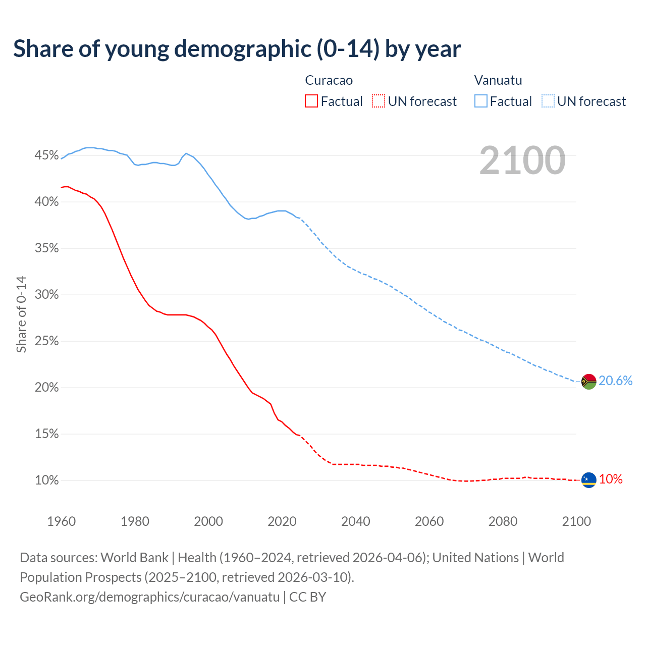 - The share of young demographic (0-15 years old) in Curacao is 14.9% vs 38.3% in Vanuatu.