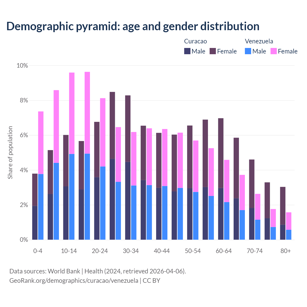 - Curacao is ranked 49/196 by median age (oldest to youngest) vs 104/196 for Venezuela.