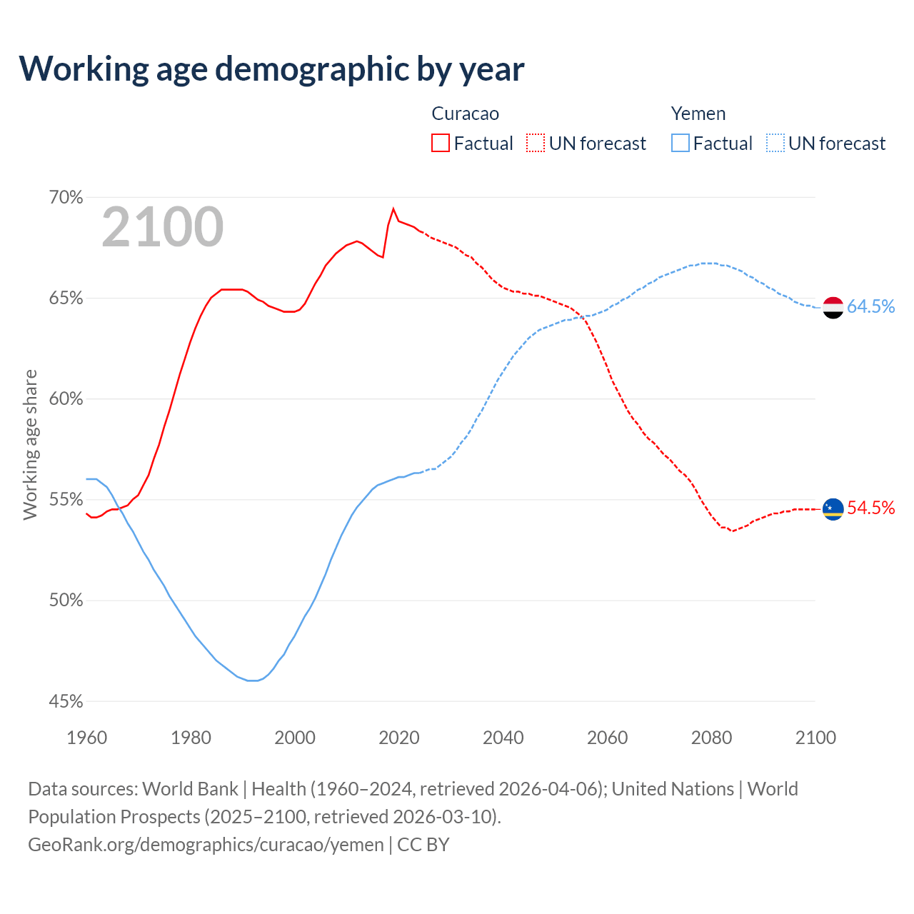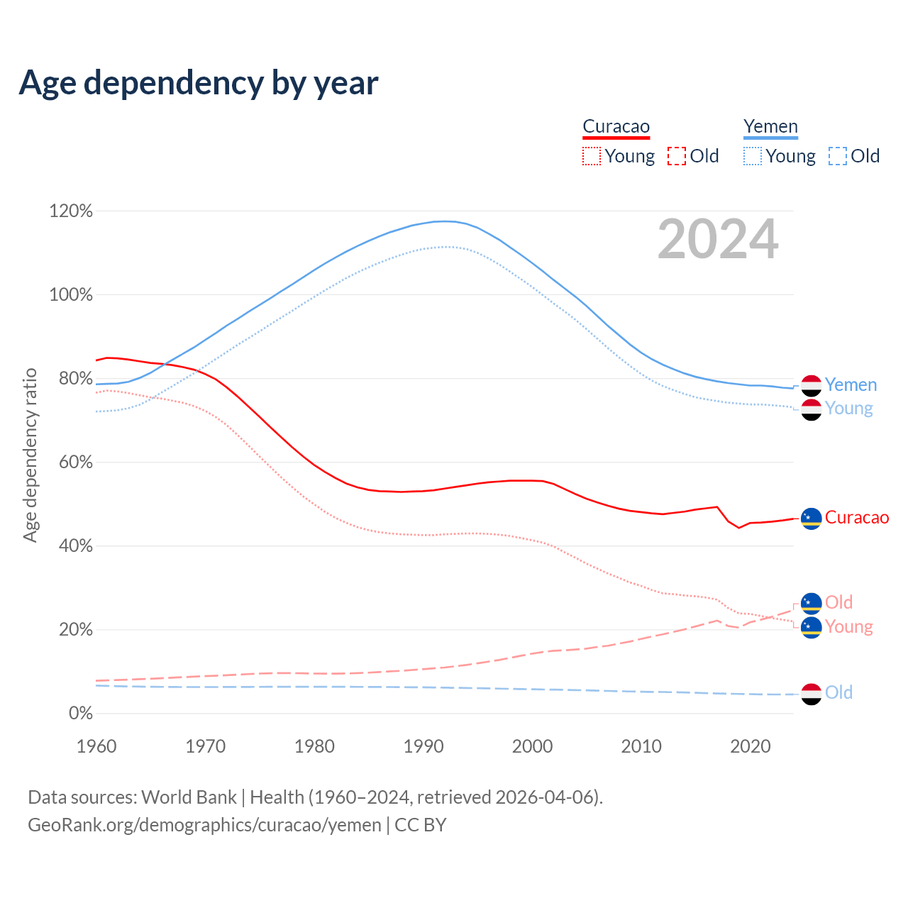 - The share of old-age demographic (65+) in Curacao is 16.8% vs 2.52% in Yemen.