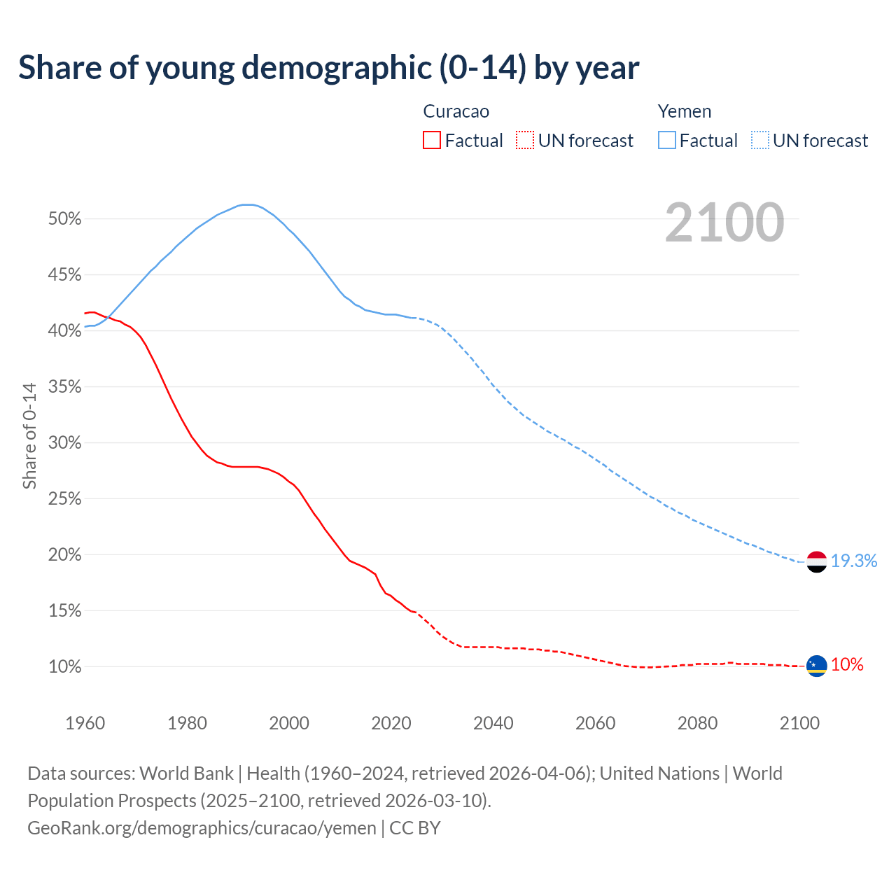 - The share of young demographic (0-15 years old) in Curacao is 14.9% vs 41.1% in Yemen.