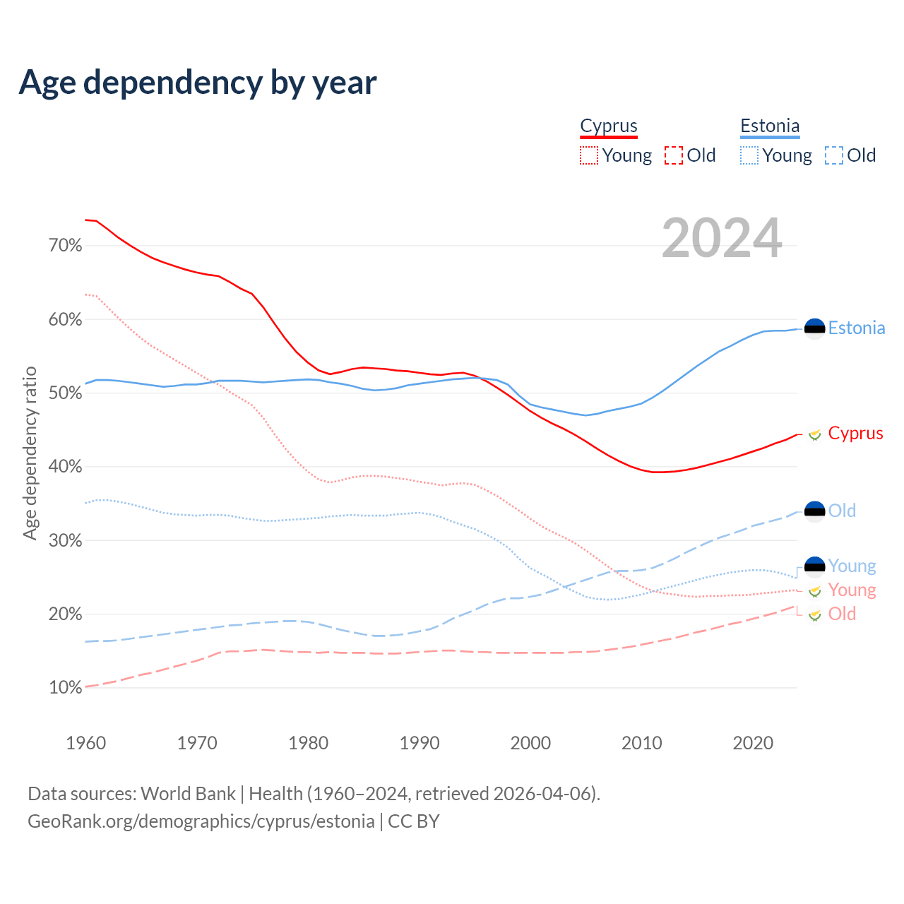 - Cyprus is ranked 52/196 by median age (oldest to youngest) vs 25/196 for Estonia.
