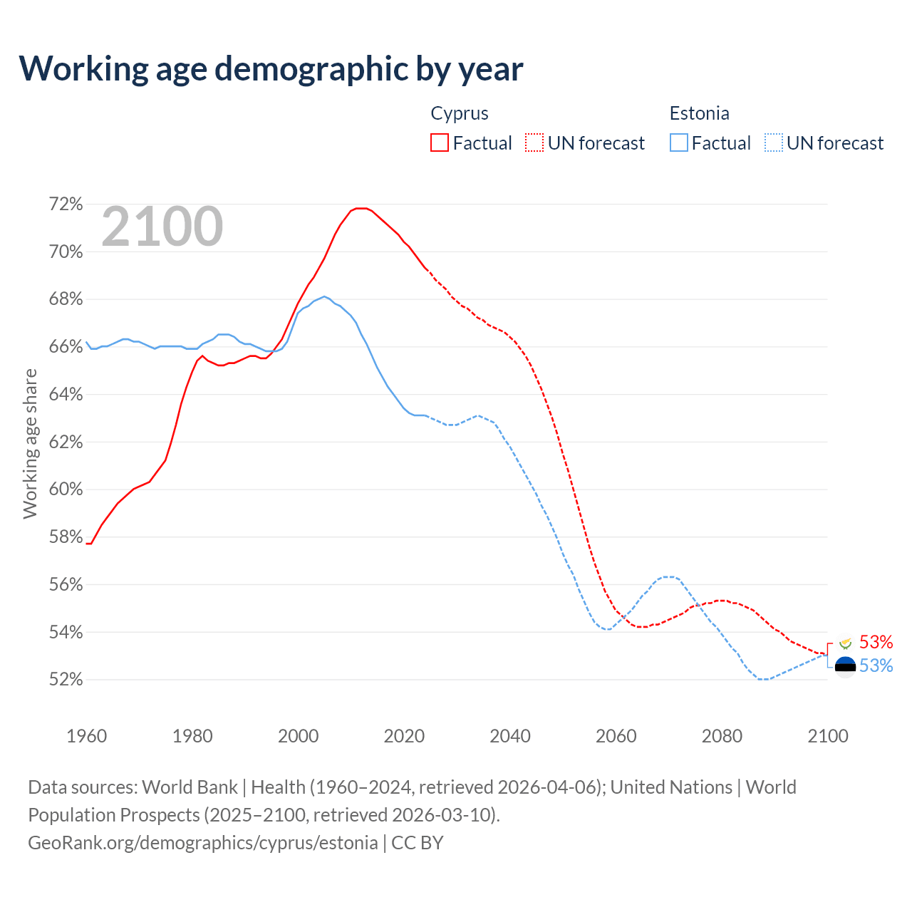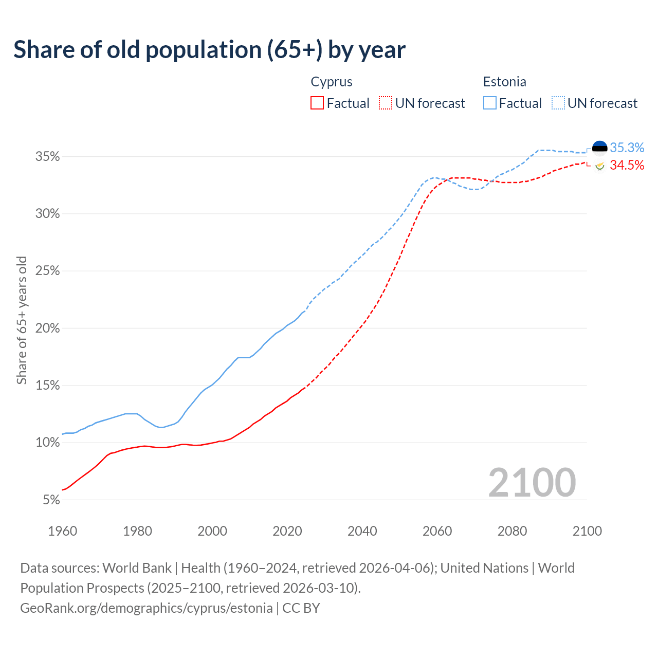 Median age Cyprus vs Estonia, 1960-2100