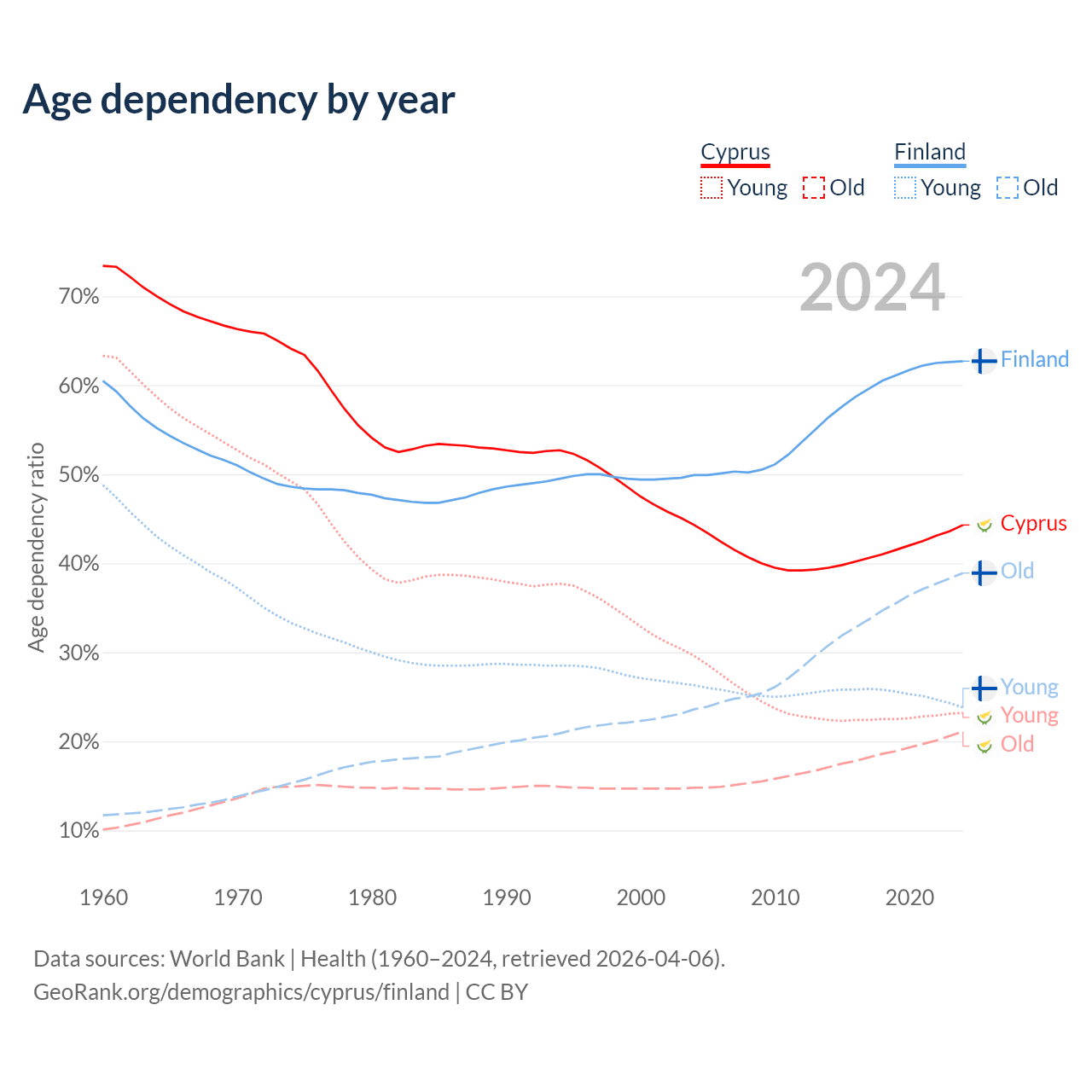 - Cyprus is ranked 52/196 by median age (oldest to youngest) vs 22/196 for Finland.