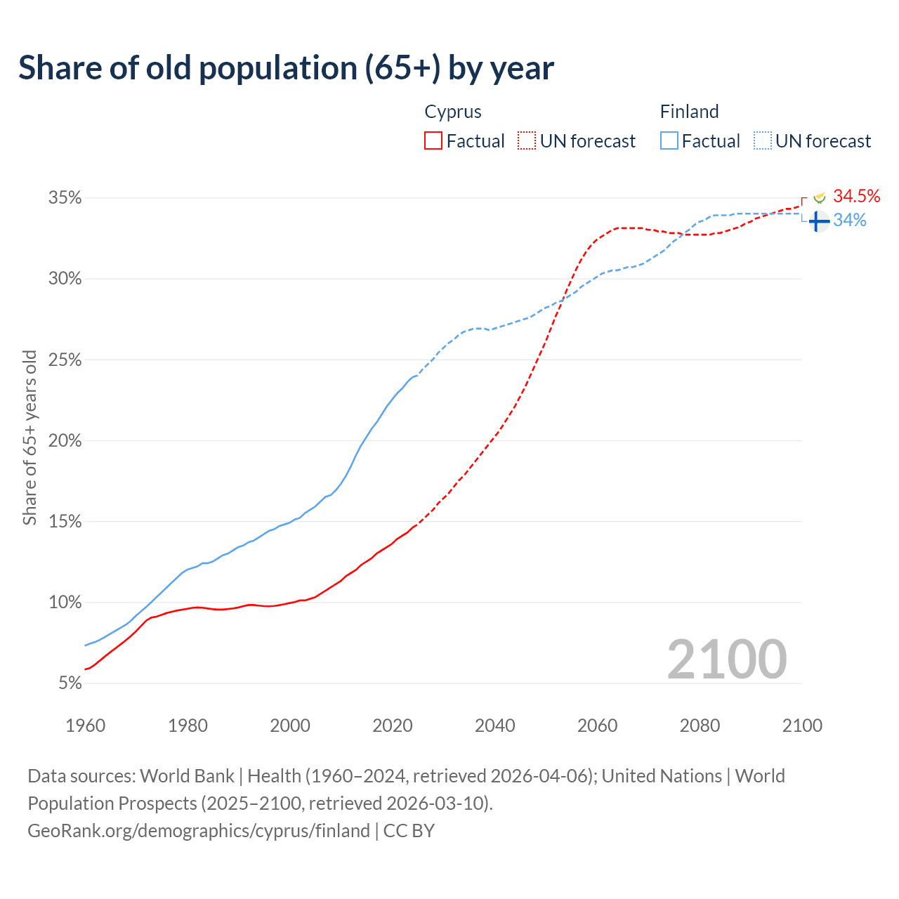 The share of older people aged 65 and over is 14.6% in Cyprus and 23.9% in Finland. Life expectancy in Cyprus compared to Finland .