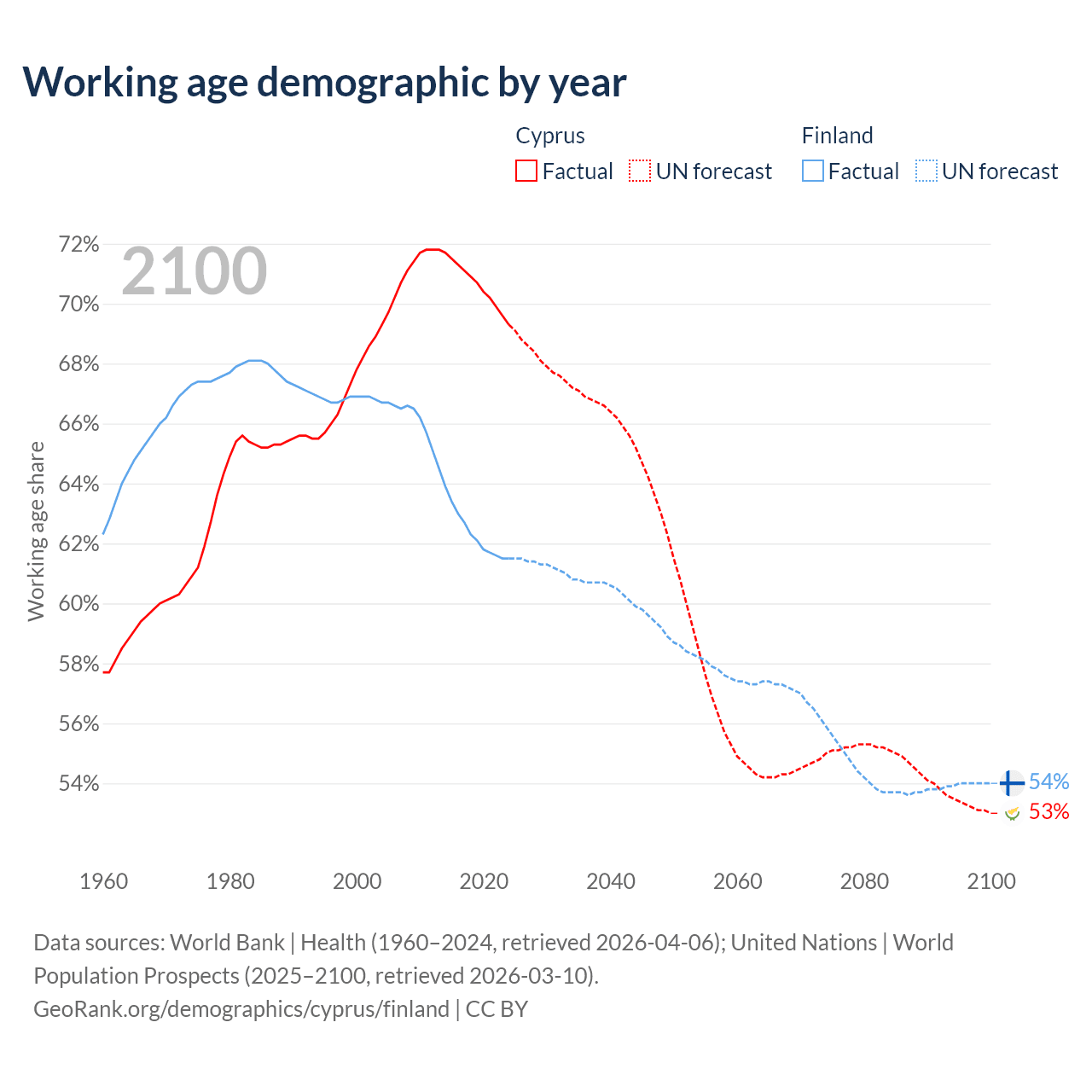 Median age Cyprus vs Finland, 1960-2100