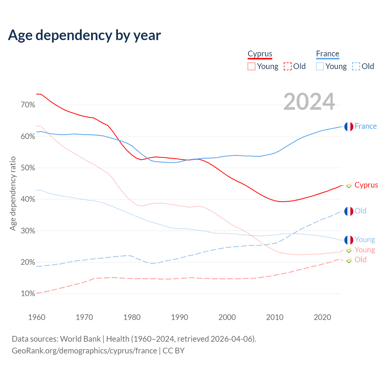 - Cyprus is ranked 52/196 by median age (oldest to youngest) vs 29/196 for France.