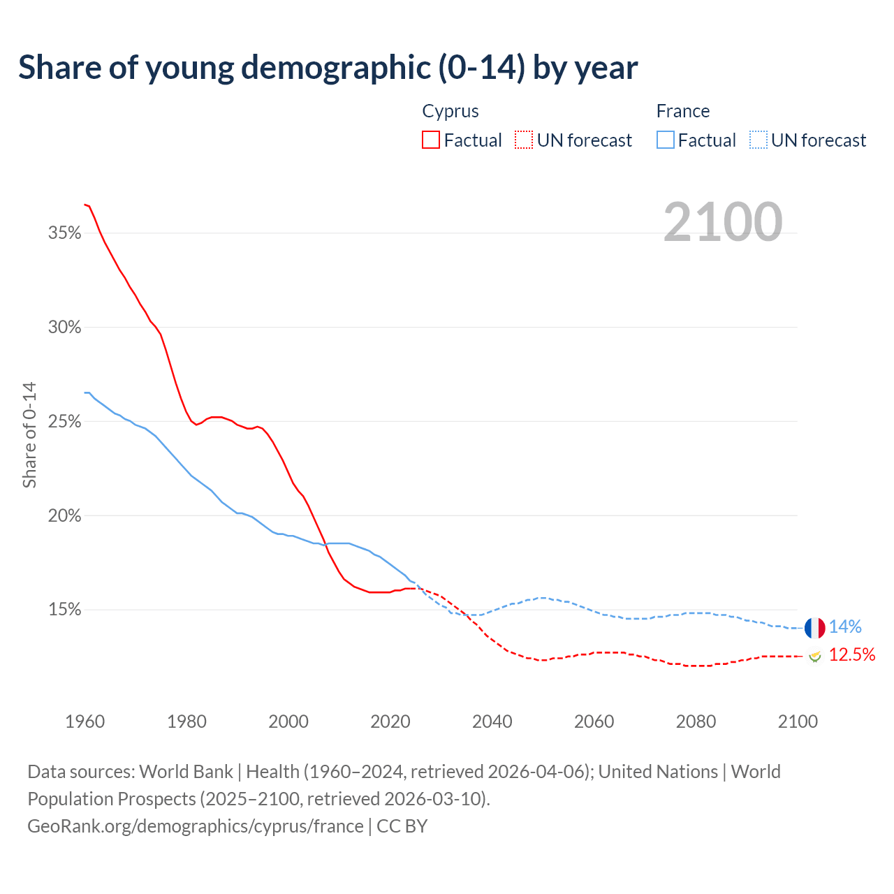 - The share of young demographic (0-15 years old) in Cyprus is 16.1% vs 16.5% in France.