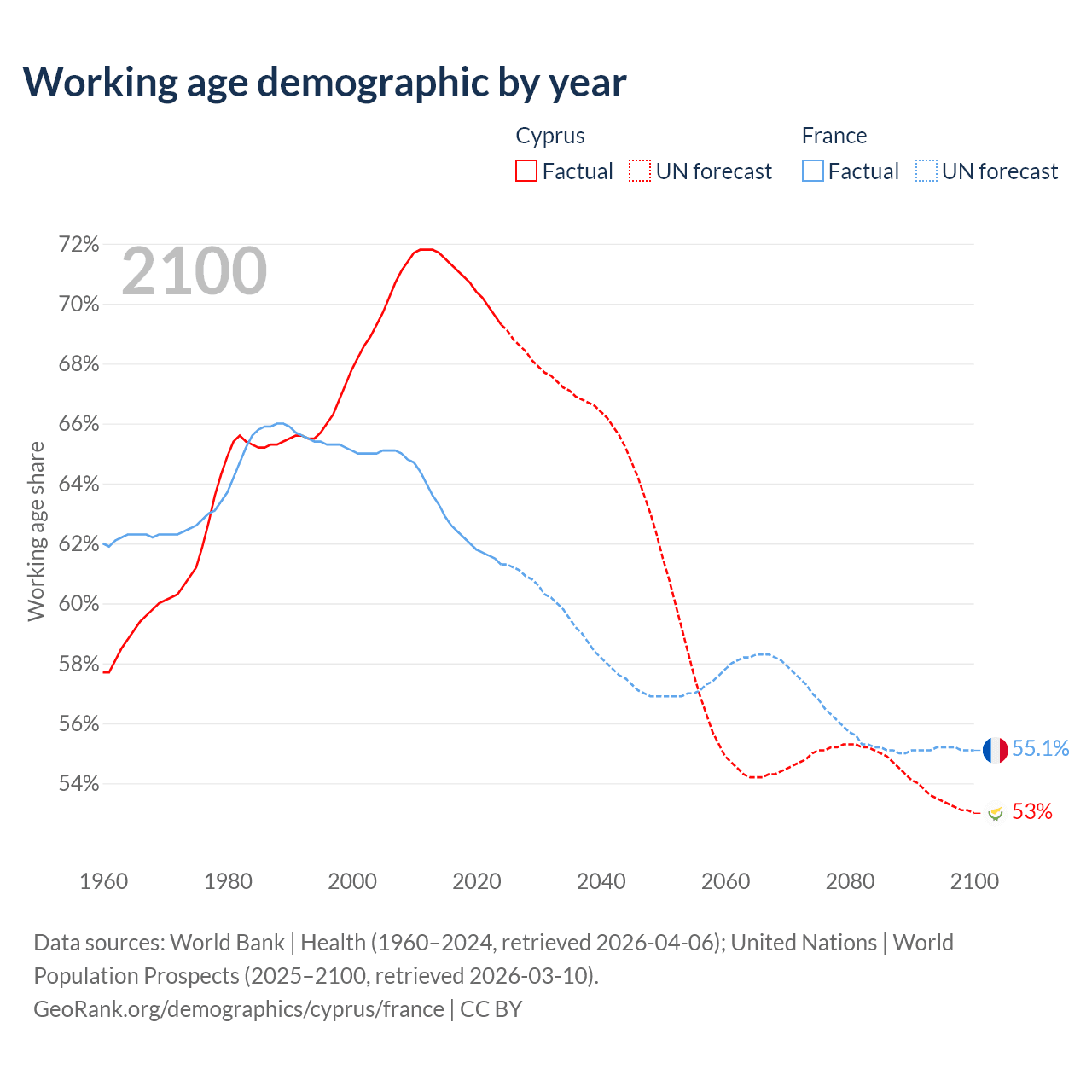Median age Cyprus vs France, 1960-2100