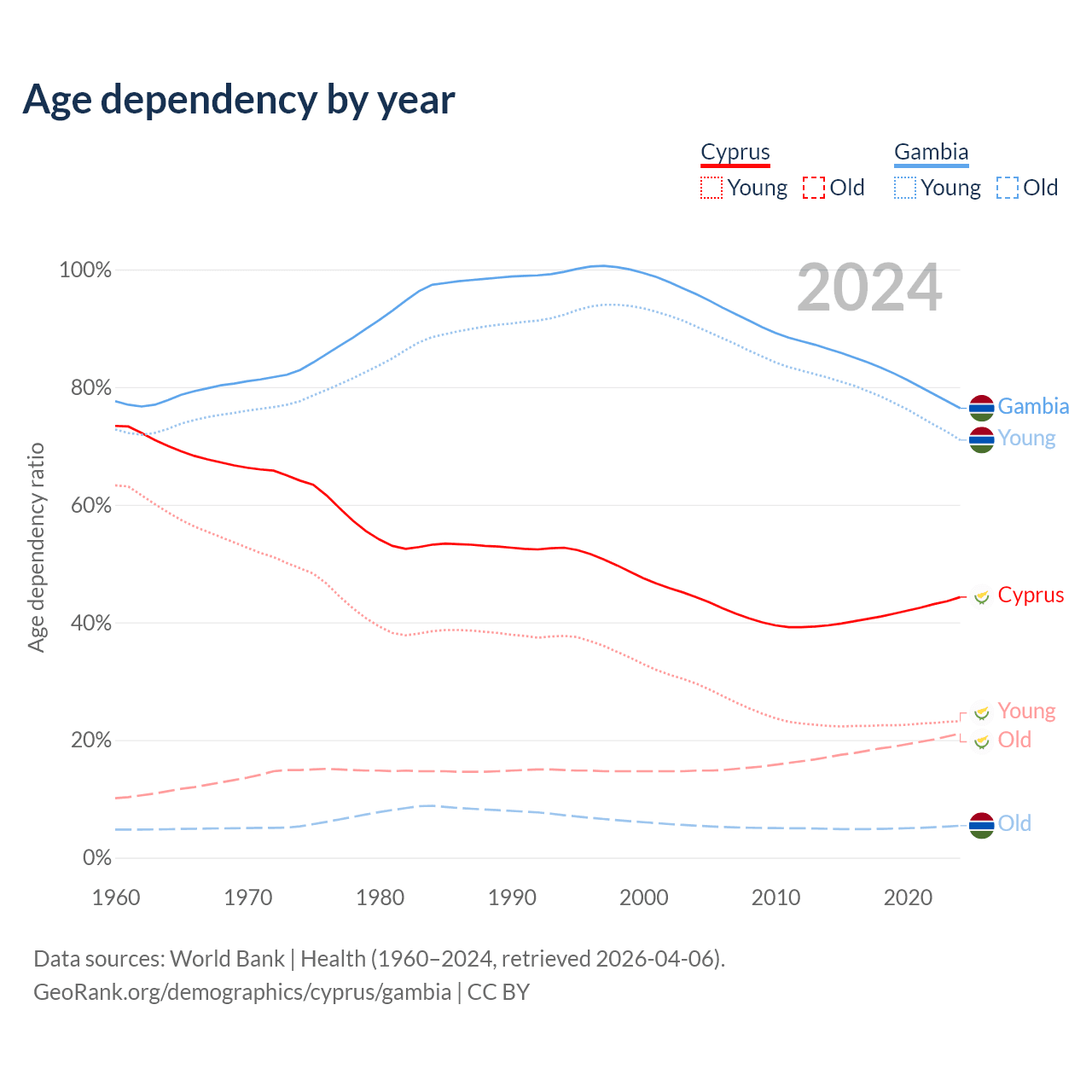 The share of older people aged 65 and over is 14.6% in Cyprus and 3.08% in the Gambia. Life expectancy in Cyprus compared to the Gambia .