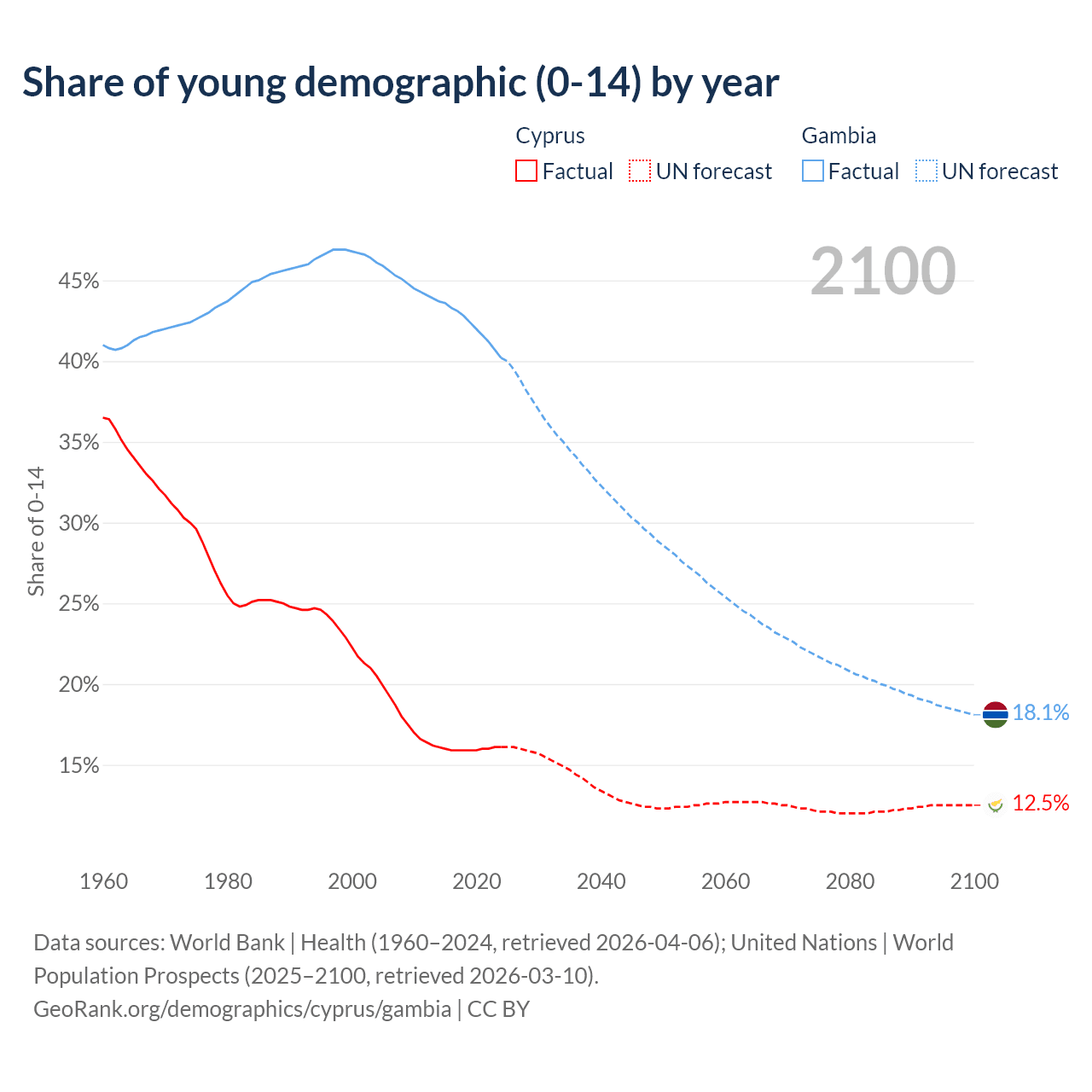- The share of young demographic (0-15 years old) in Cyprus is 16.1% vs 40.2% in the Gambia.