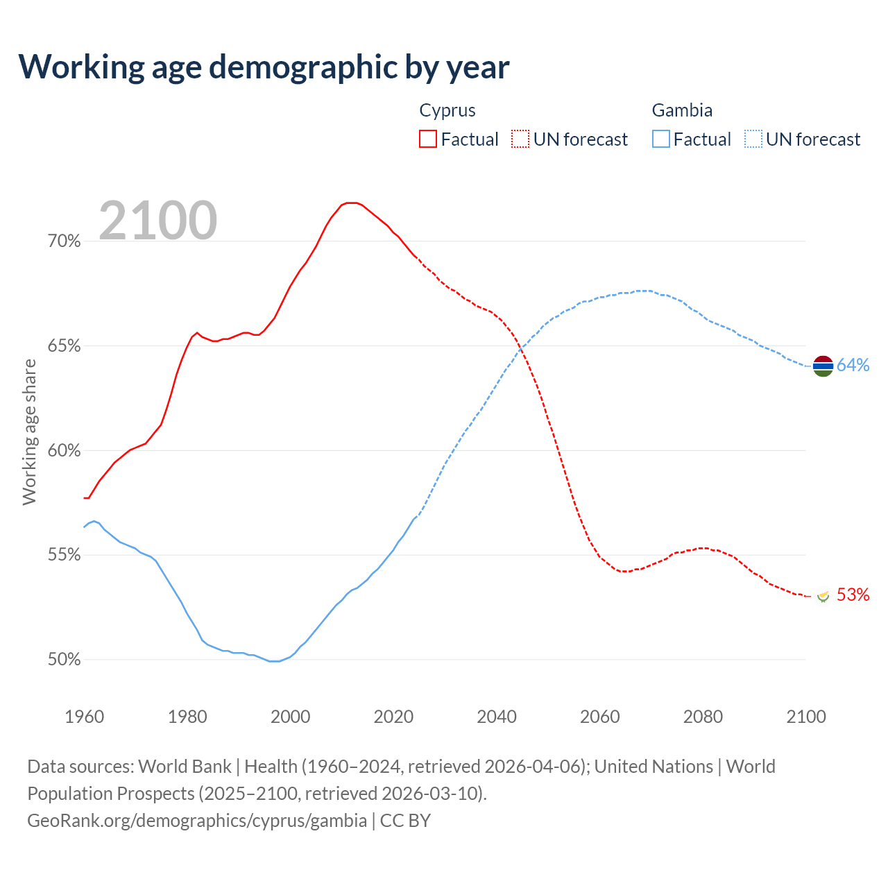 - Cyprus has 961K working age adults (aged 15-64) vs 1.64M in the Gambia.