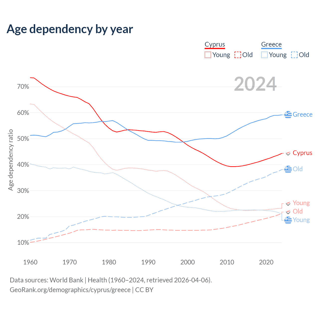 The share of older people aged 65 and over is 14.6% in Cyprus and 23.9% in Greece. Life expectancy in Cyprus compared to Greece .