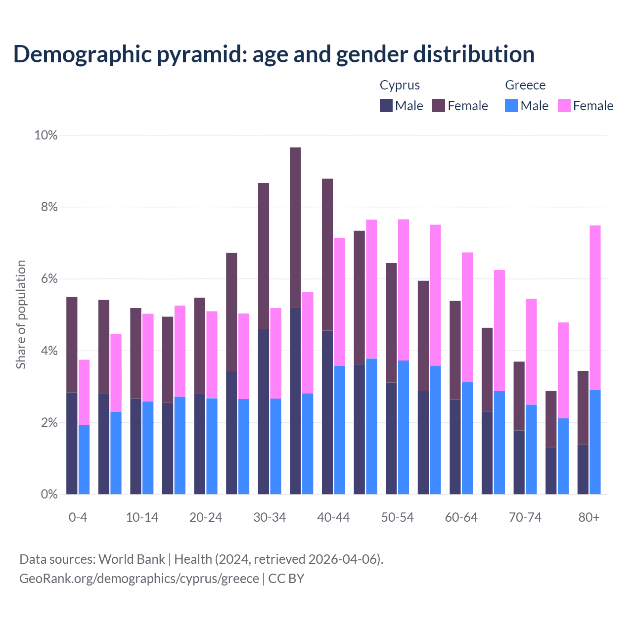- Cyprus is ranked 52/196 by median age (oldest to youngest) vs 6/196 for Greece.