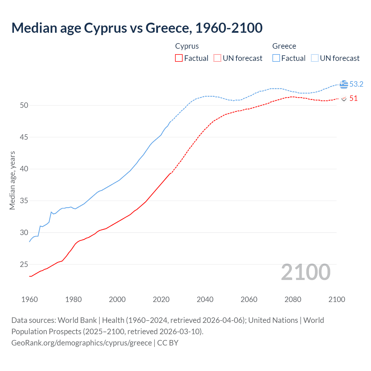 - The median age in Cyprus is 39.2 years compared to 47.3 years in Greece.