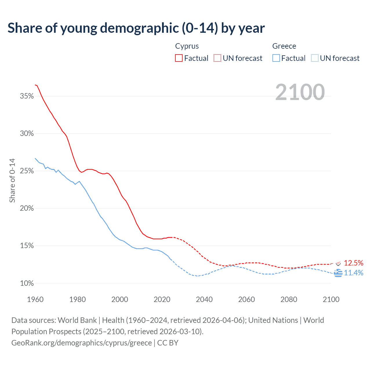 - The share of young demographic (0-15 years old) in Cyprus is 16.1% vs 13.2% in Greece.