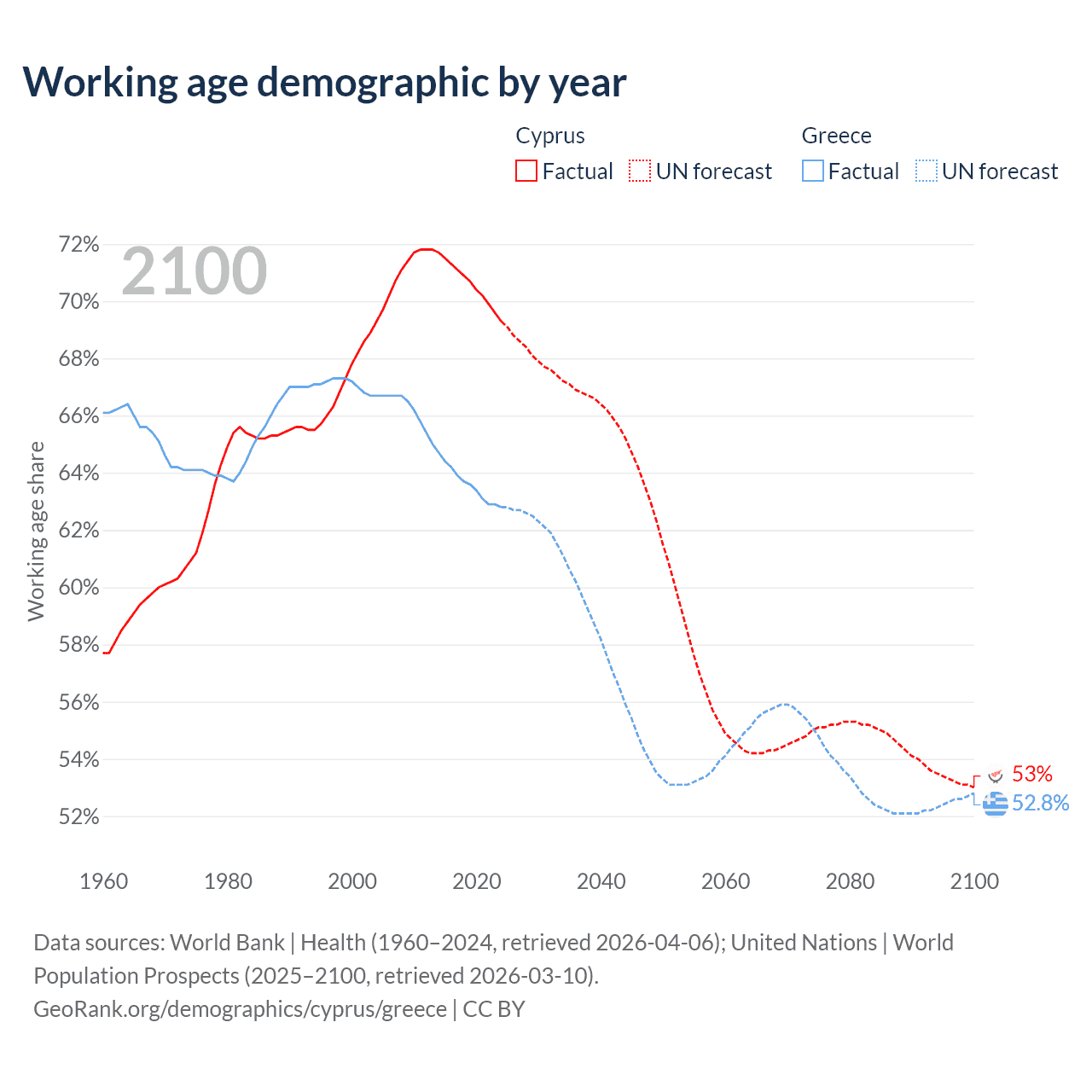 - Cyprus has 961K working age adults (aged 15-64) vs 6.4M in Greece.