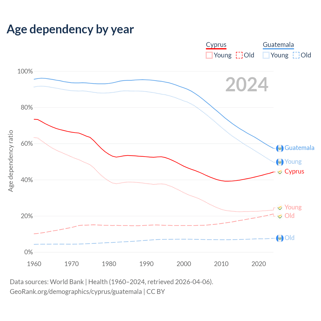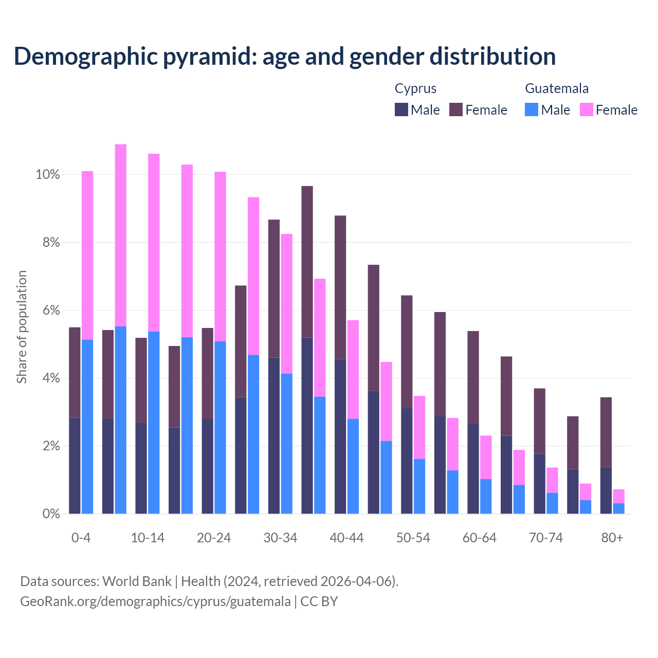 - Cyprus is ranked 52/196 by median age (oldest to youngest) vs 137/196 for Guatemala.