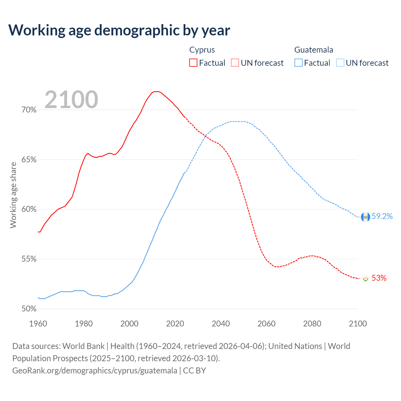 - Cyprus has 961K working age adults (aged 15-64) vs 12.1M in Guatemala.