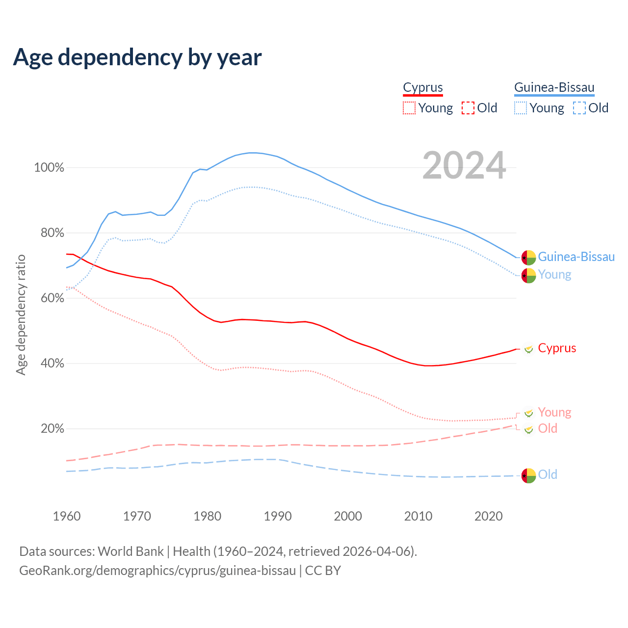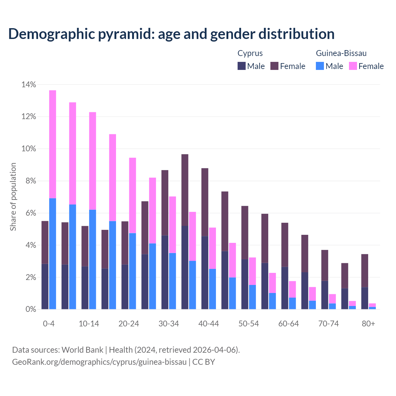 - Cyprus is ranked 52/196 by median age (oldest to youngest) vs 164/196 for Guinea-Bissau.