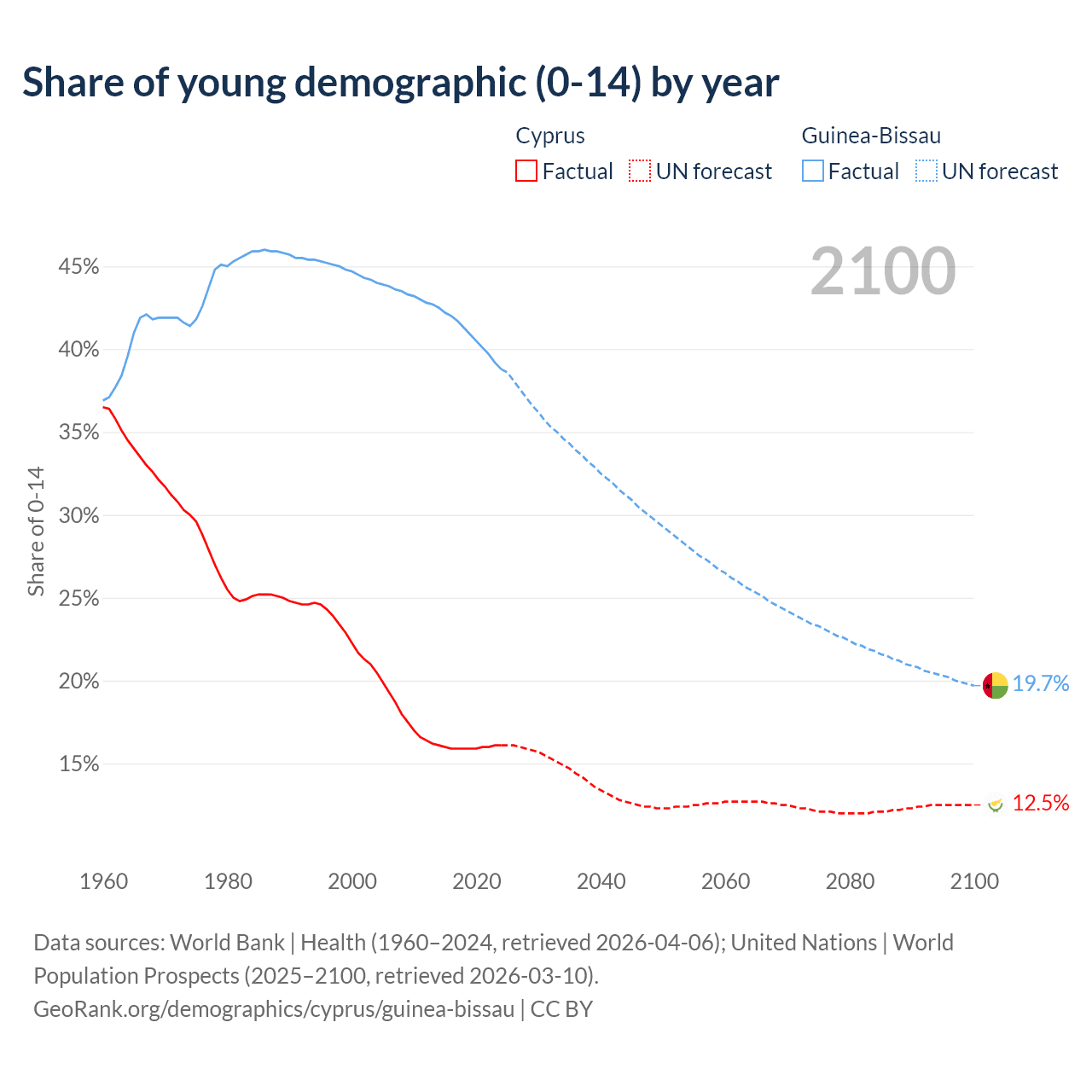 Median age Cyprus vs Guinea-Bissau, 1960-2100