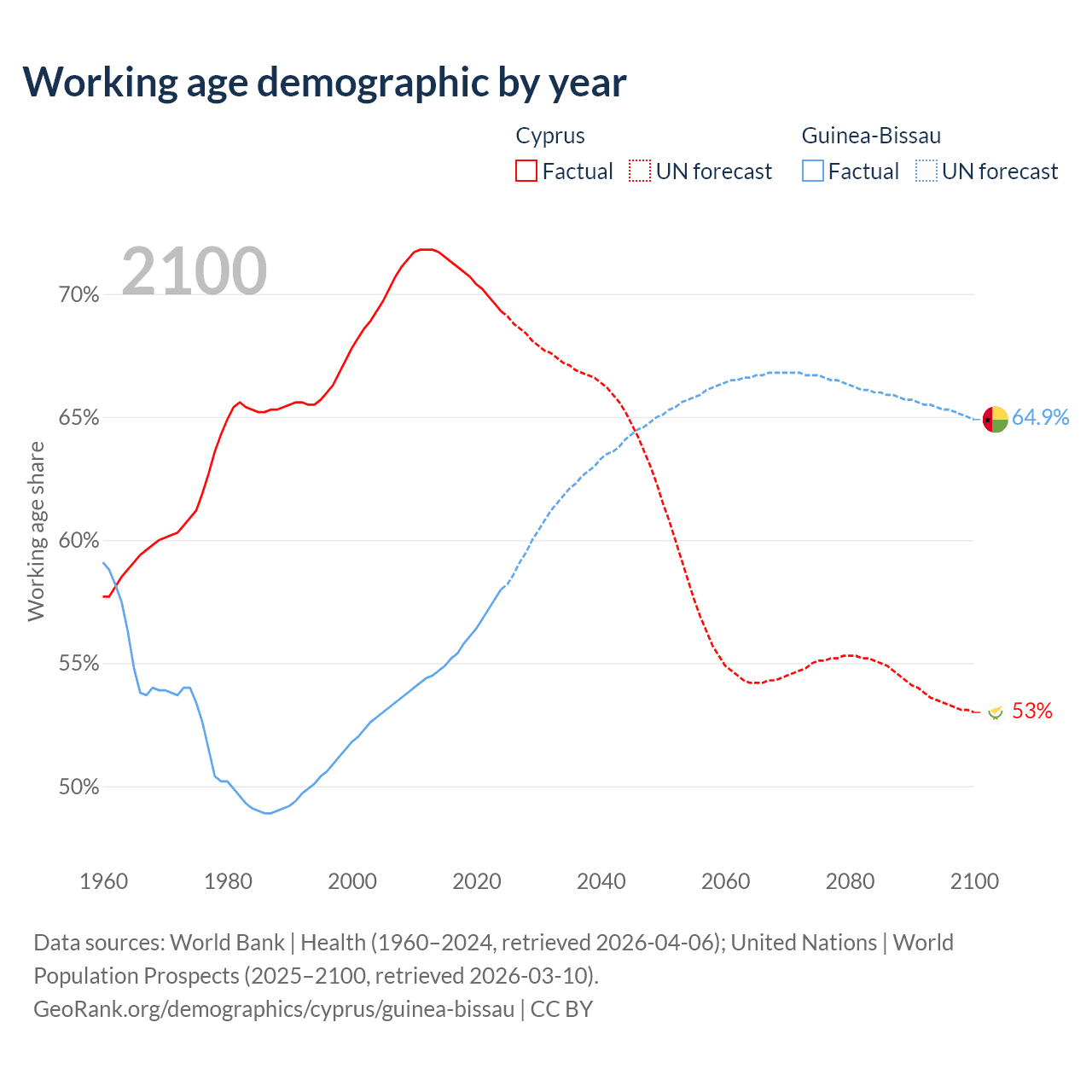 - Cyprus has 961K working age adults (aged 15-64) vs 1.34M in Guinea-Bissau.