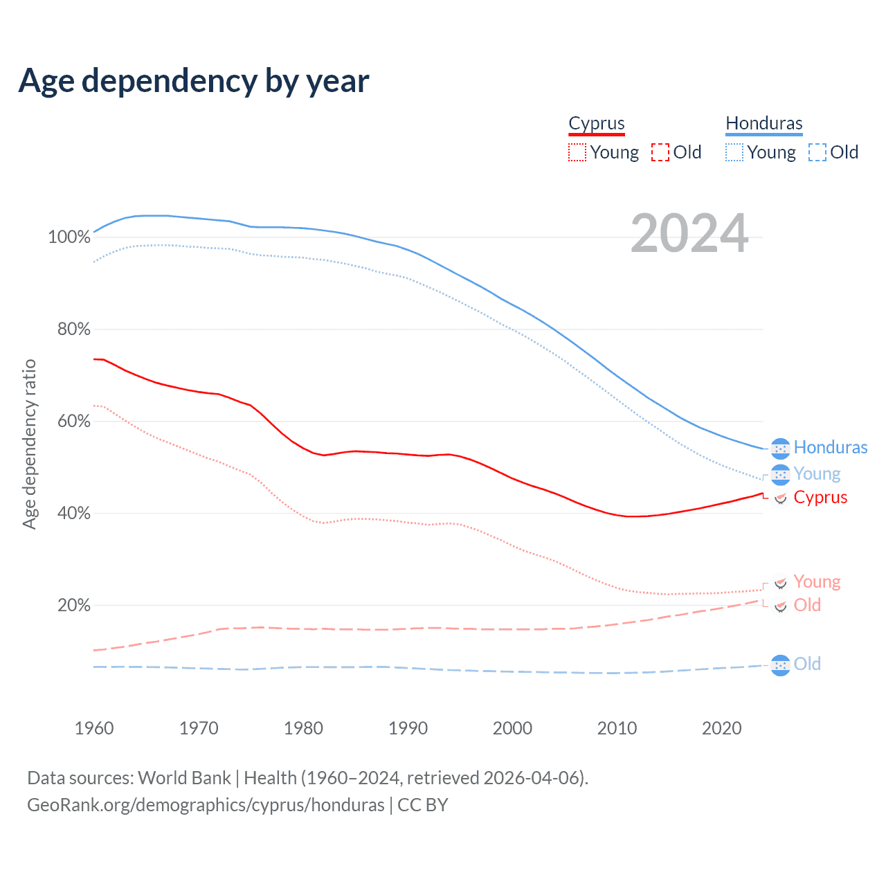 Data sources: World Bank | Health (1960–2024, retrieved 2026-04-06); U.S. Census Bureau (1960–2024, retrieved 2026-02-08).