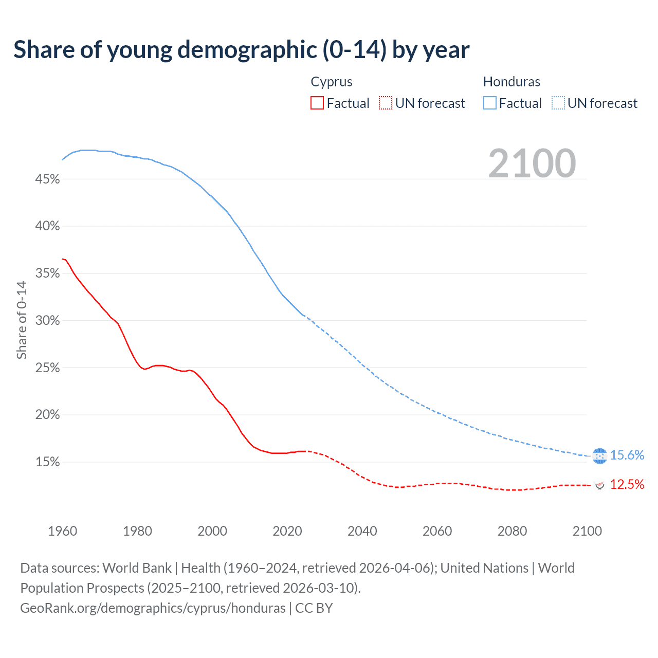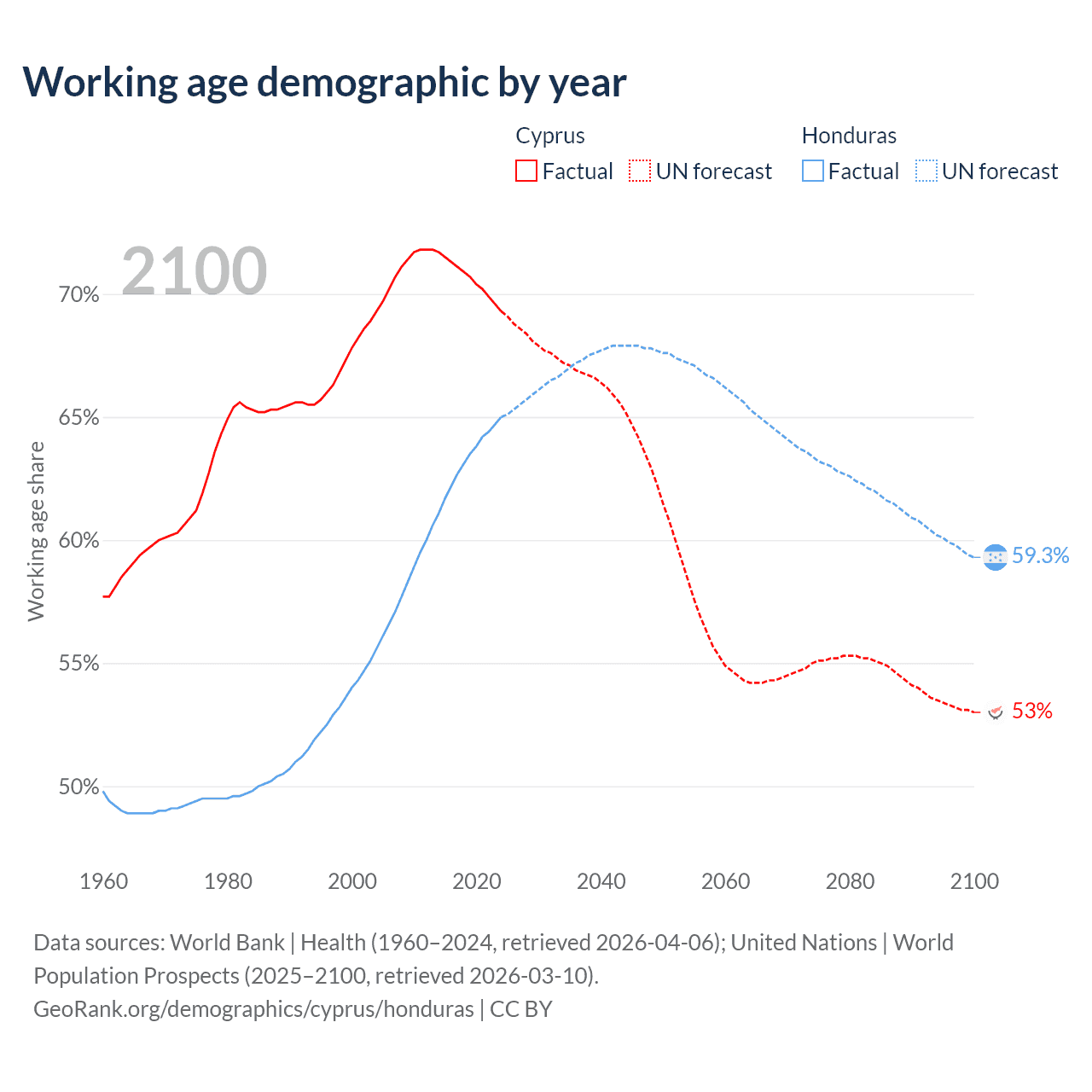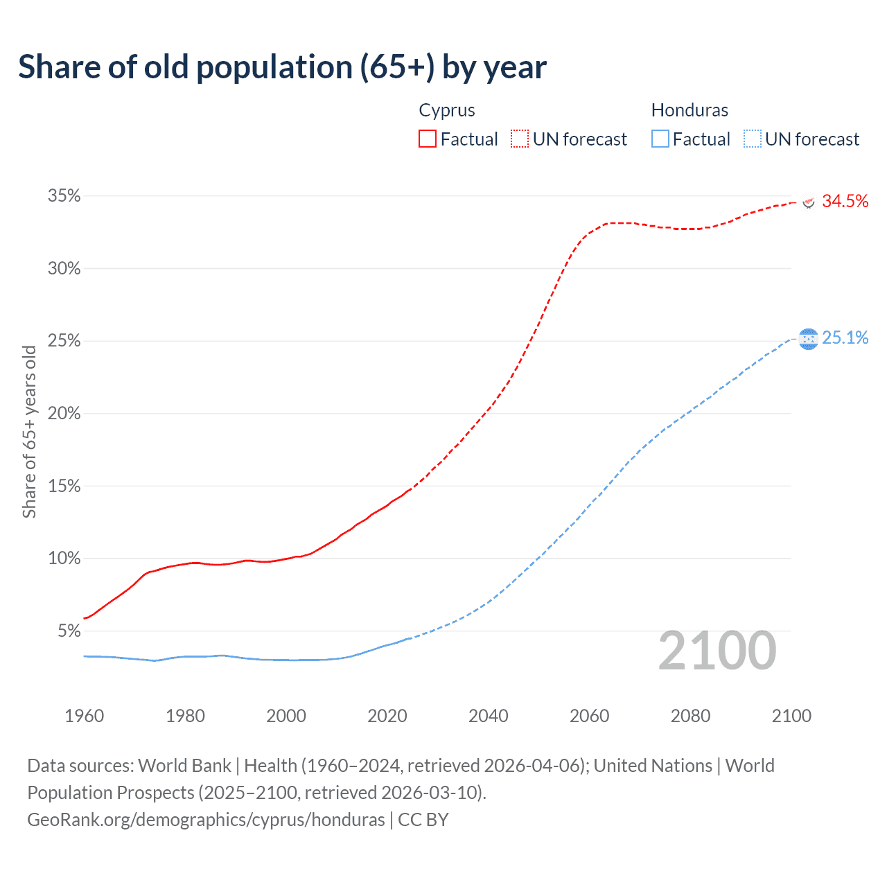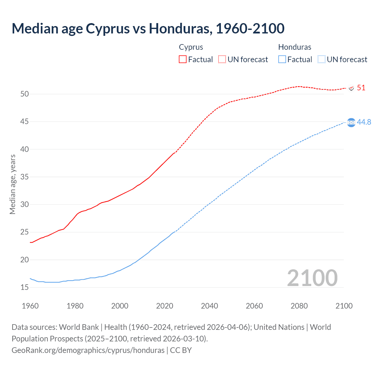 Median age Cyprus vs Honduras, 1960-2100
