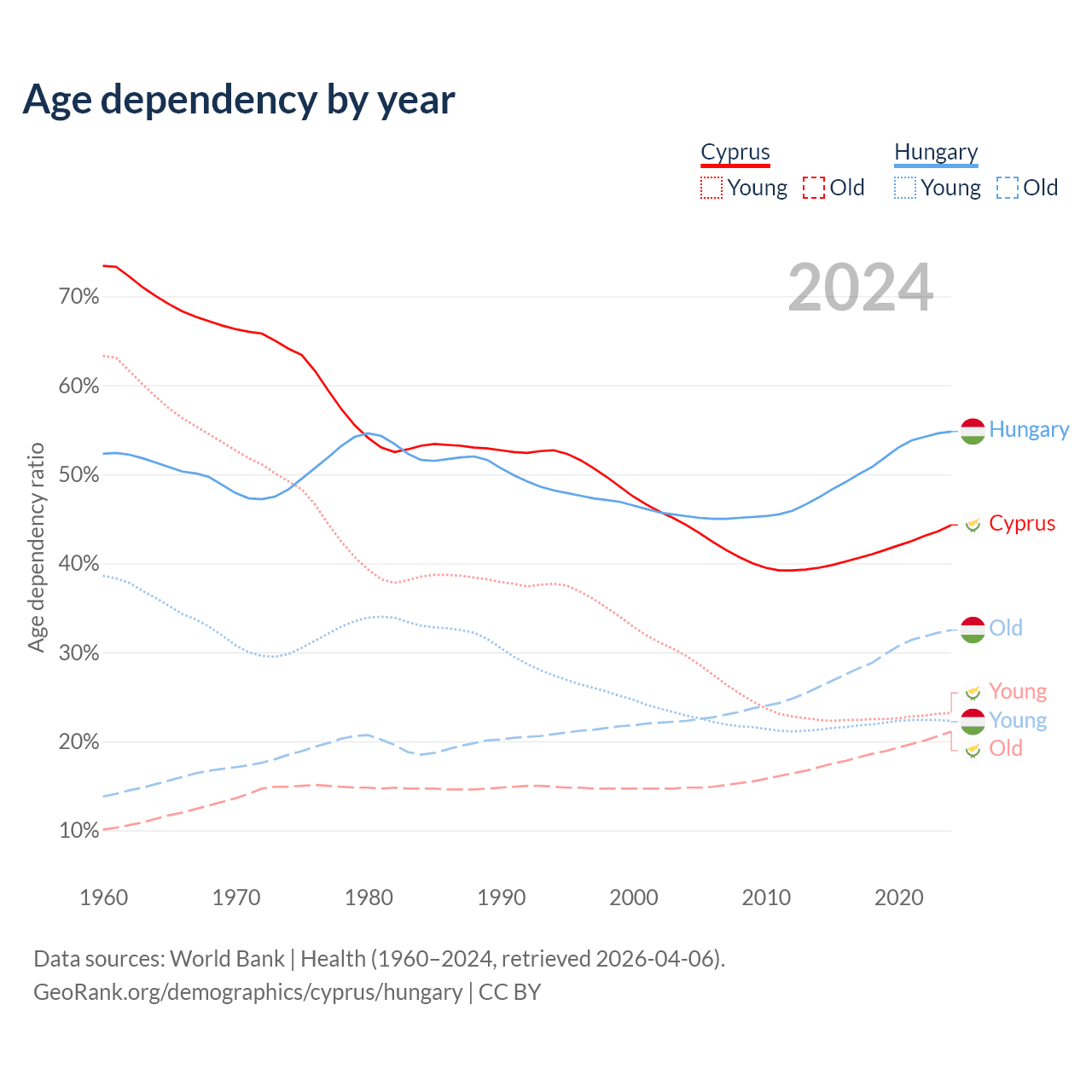 - Cyprus is ranked 52/196 by median age (oldest to youngest) vs 17/196 for Hungary.