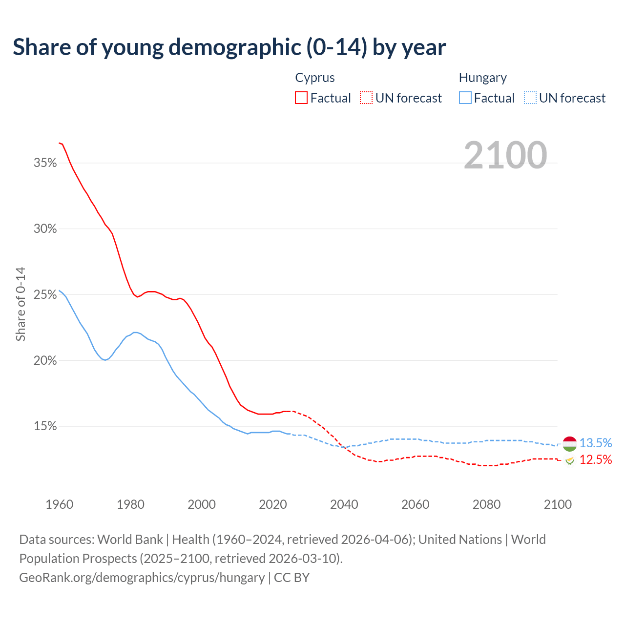 - The share of young demographic (0-15 years old) in Cyprus is 16.1% vs 14.4% in Hungary.
