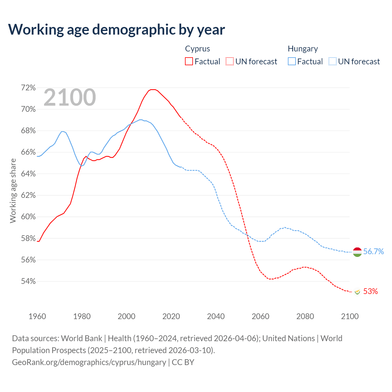 Median age Cyprus vs Hungary, 1960-2100