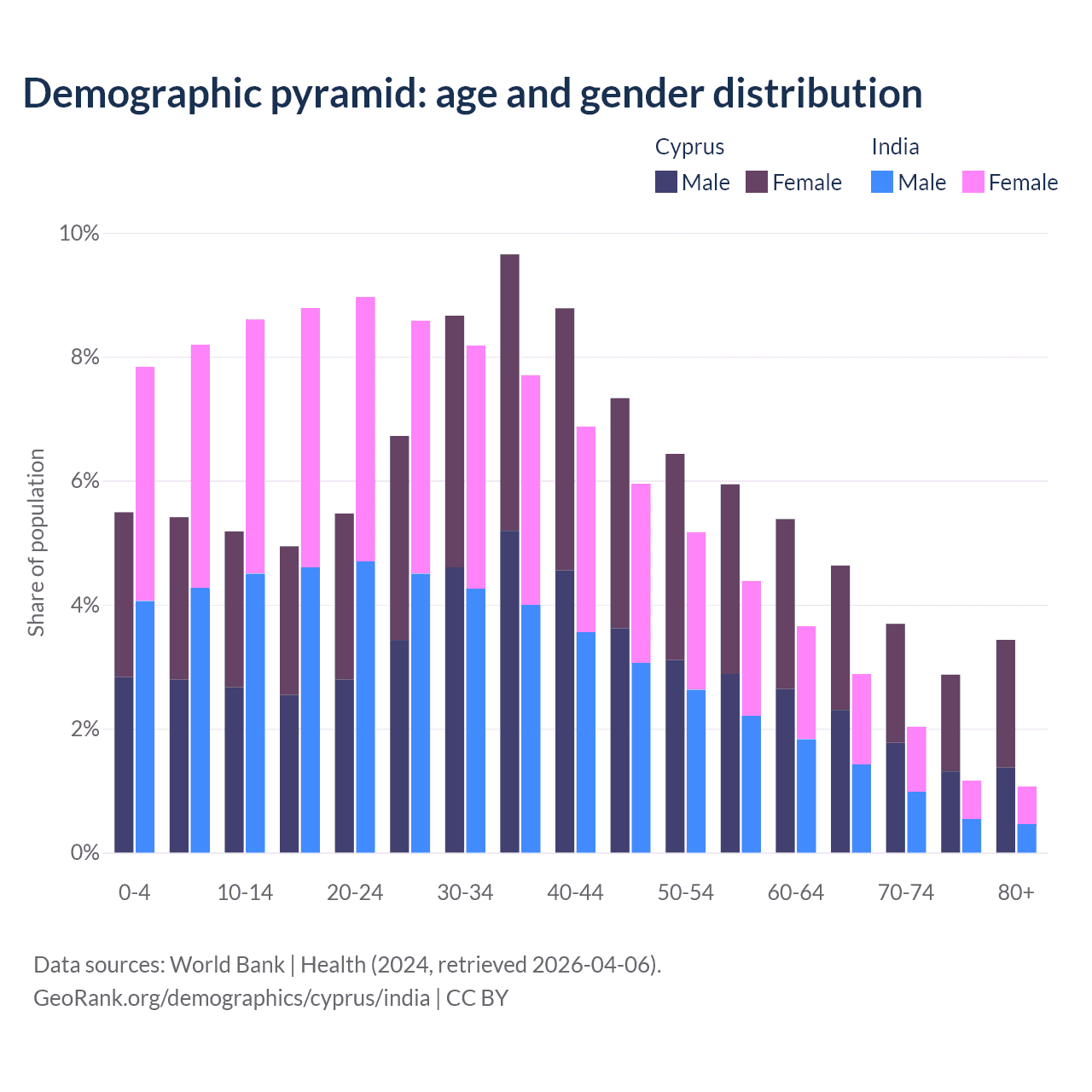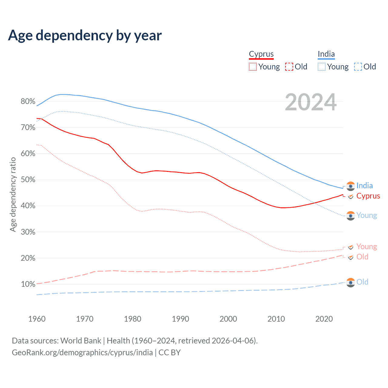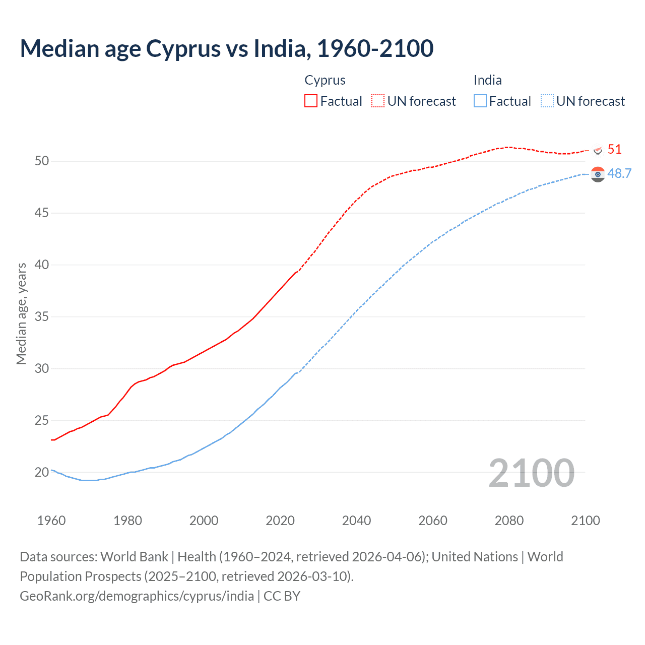 - Cyprus is ranked 52/196 by median age (oldest to youngest) vs 108/196 for India.