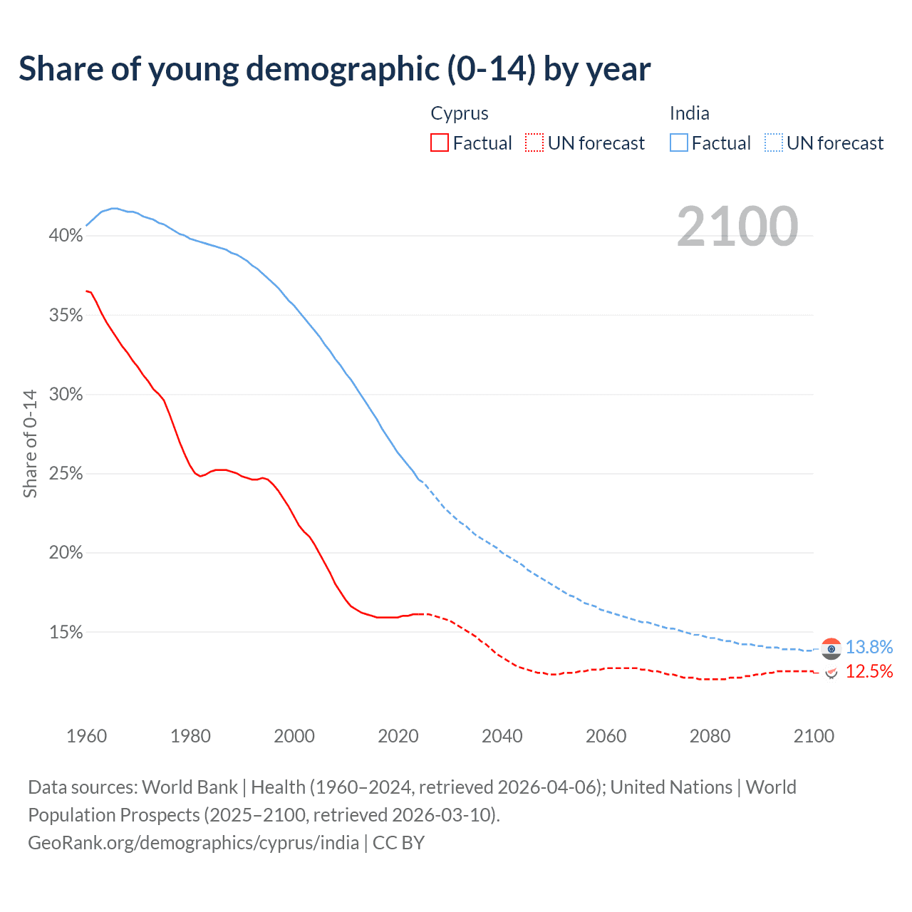 - The share of young demographic (0-15 years old) in Cyprus is 16.1% vs 24.6% in India.