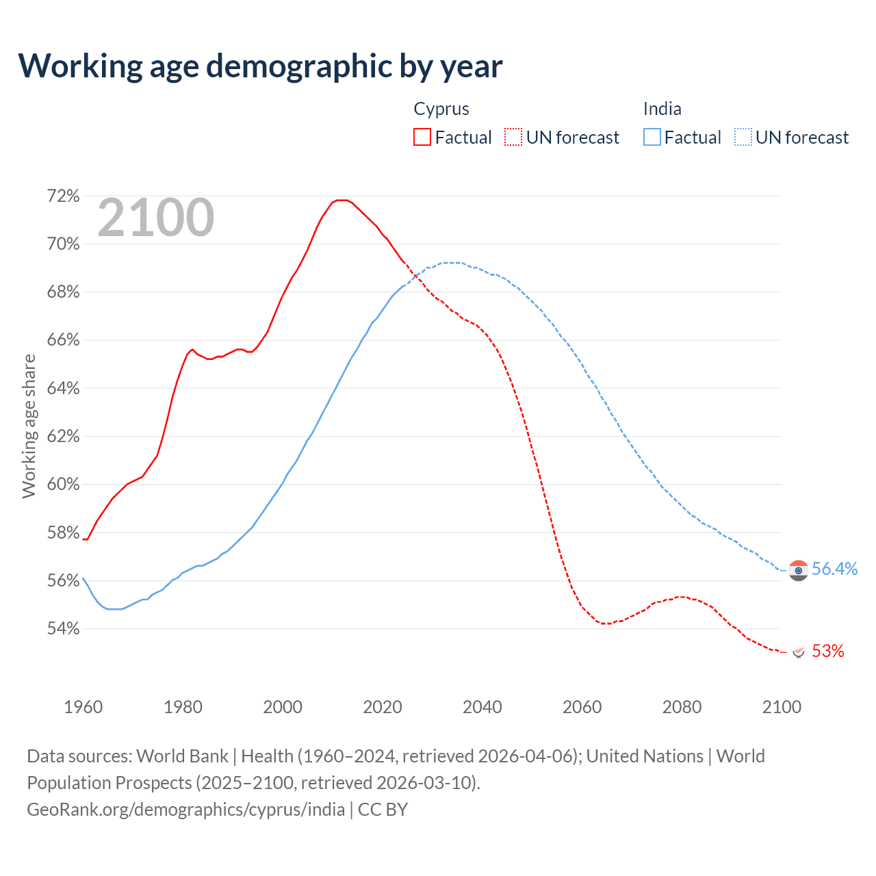 - Cyprus has 961K working age adults (aged 15-64) vs 1.01B in India.