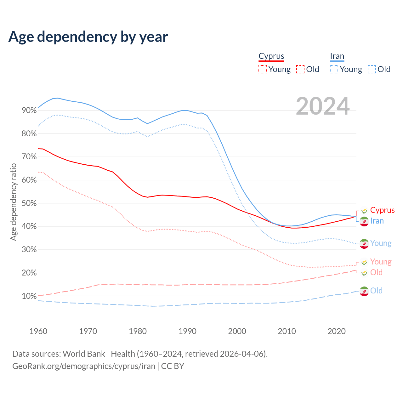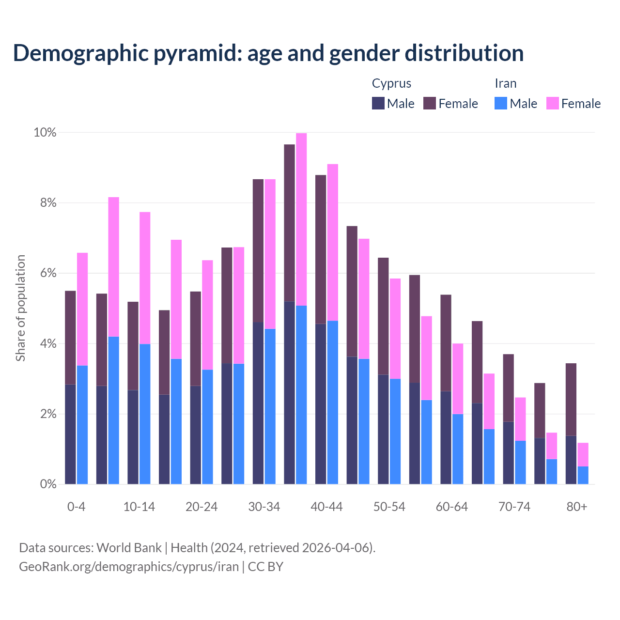 - Cyprus is ranked 52/196 by median age (oldest to youngest) vs 79/196 for Iran.