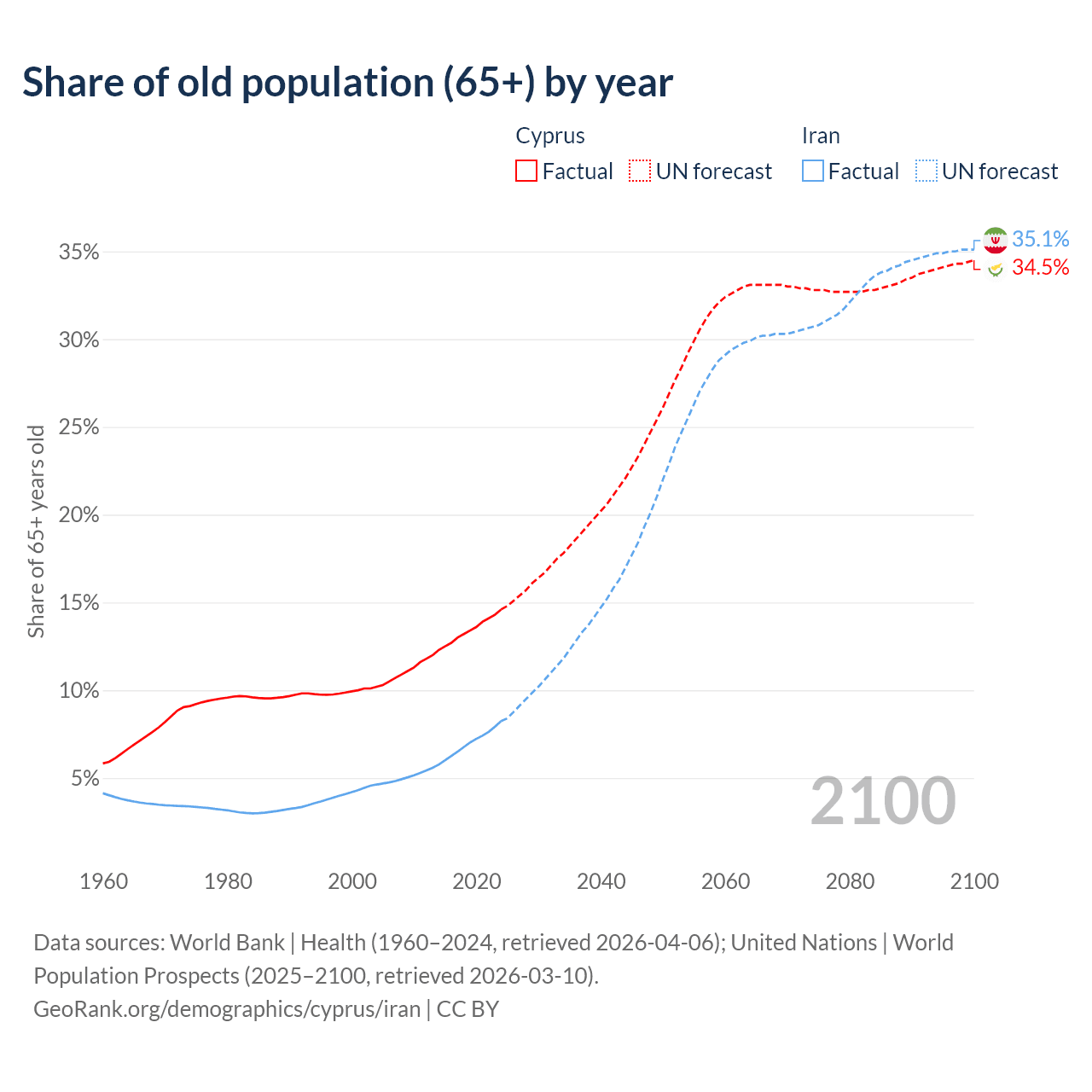 - The share of old-age demographic (65+) in Cyprus is 14.6% vs 8.24% in Iran.