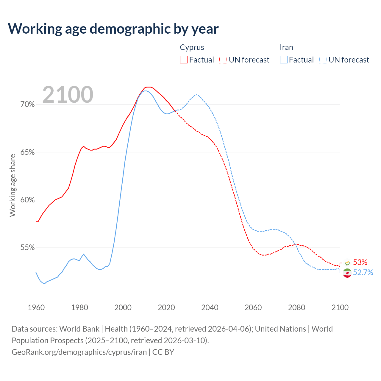 - Cyprus has 961K working age adults (aged 15-64) vs 64.8M in Iran.