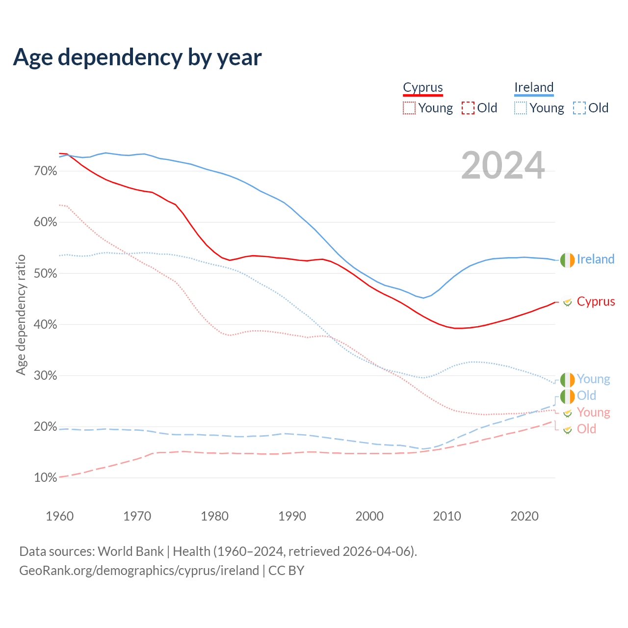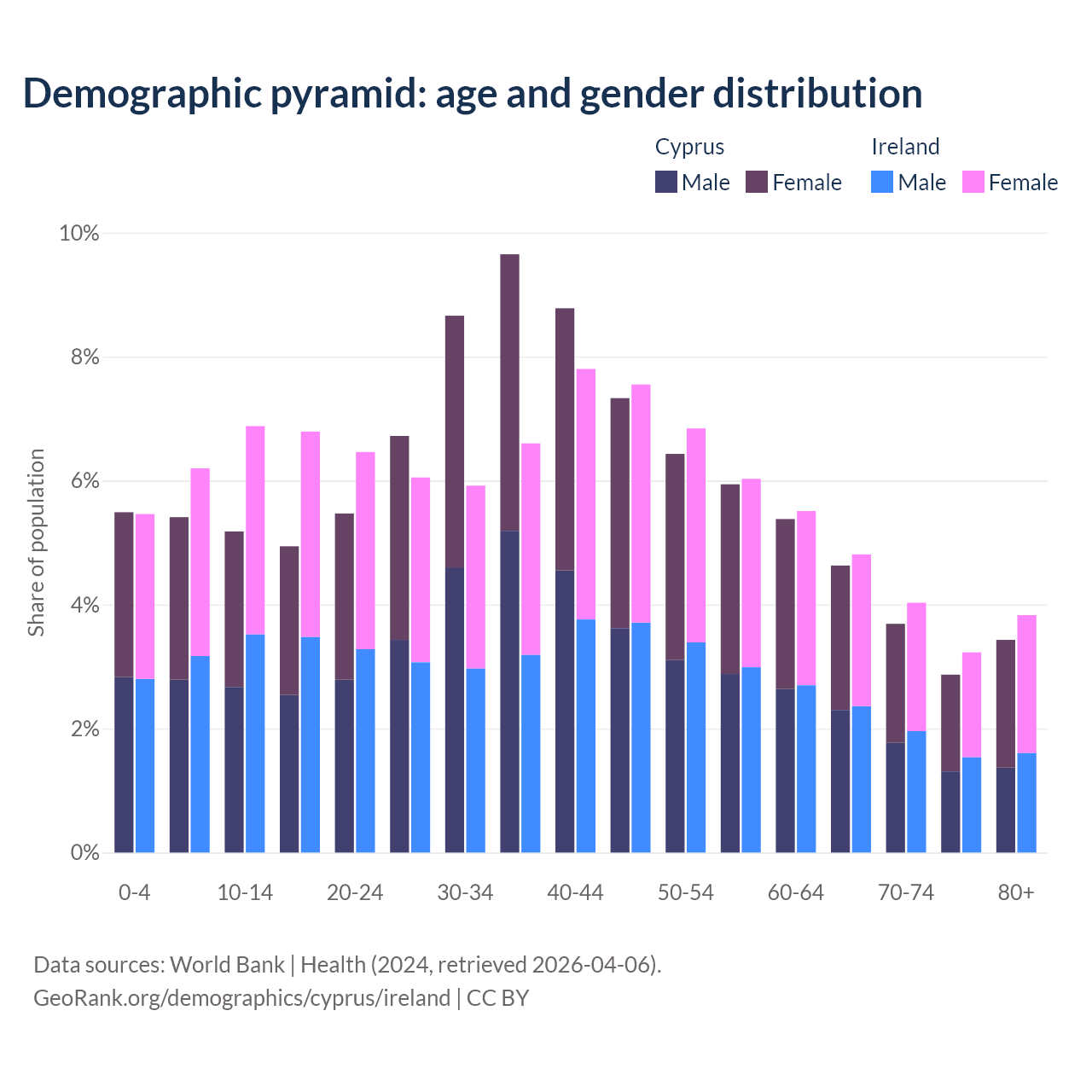 - Cyprus is ranked 52/196 by median age (oldest to youngest) vs 48/196 for Ireland.