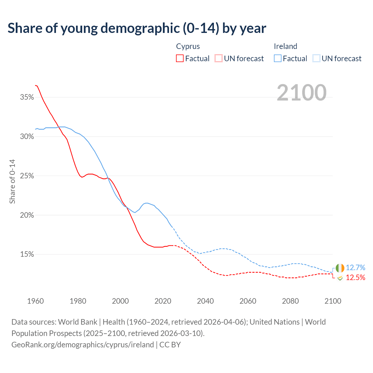 - The share of young demographic (0-15 years old) in Cyprus is 16.1% vs 18.6% in Ireland.